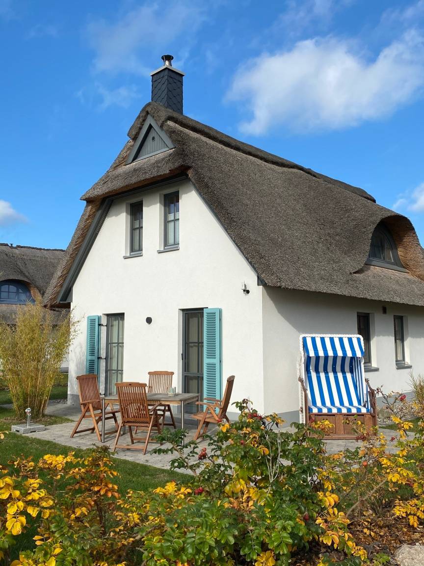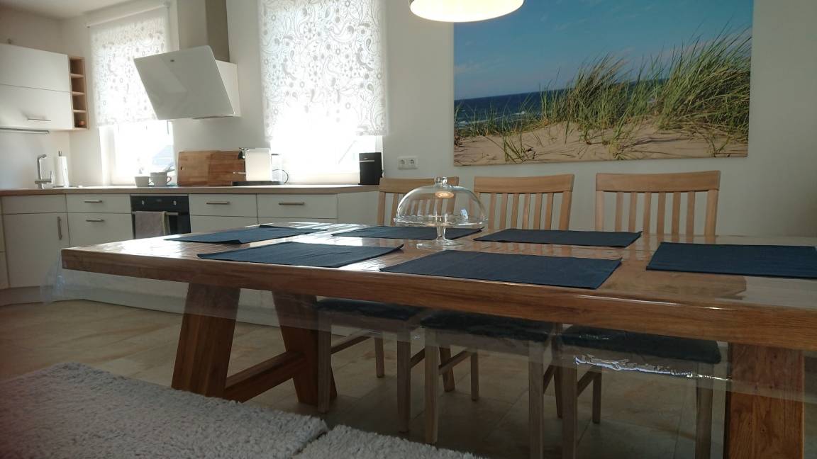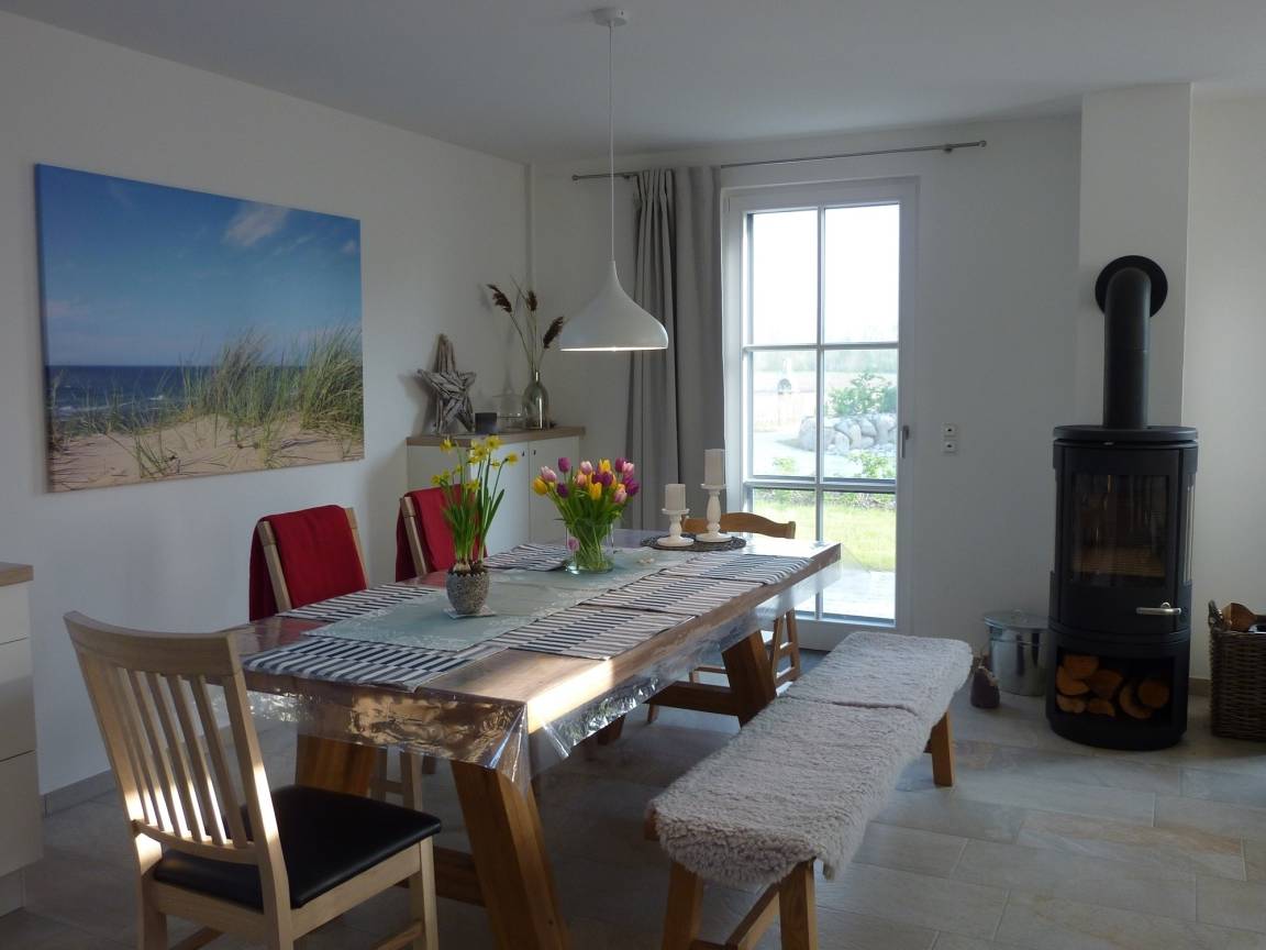 "Hygge" - das Glücksgefühl, das sich einstellt, wenn man mit Familie und Freunden gemeinsam Zeit verbringt, lacht, isst oder einfach mal in Ruhe die Natur genießt! Getreu nach diesem Motto freuen wir uns, Sie in unserem 2018 neu erbauten Reetdachferienhaus begrüßen zu dürfen. Eingebettet von einem typisch norddeutschen Steinwall mit im Sommer wunderbar duftenden Wildrosen und umgeben von einem schönen Garten, liegt das Ferienhaus nur wenige Minuten zu Fuß vom Meer entfernt. Bereits beim Durchschreiten des weißen Gartentörchens werden Sie in Urlaubsstimmung versetzt. Das gesamte Haus ist im nordisch, leichten Scandi - Style eingerichtet. Im großzügigen, ebenerdigen Wohn- u. Essbereich mit kompl. eingerichteter Küche, lässt es sich wunderbar entspannt u. ausgiebig frühstücken, stundenlang spielen oder genüsslich "chillen" - Internet-TV (mit Netflix) und Musikanlage vorhanden! Sauna mit Wellnessdusche, separates WC mit Fenster u. Hauswirtschaftsraum mit Waschmaschine, Wäscheständer, Bügeleisen u. -brett befinden sich ebenfalls im Erdgeschoss.