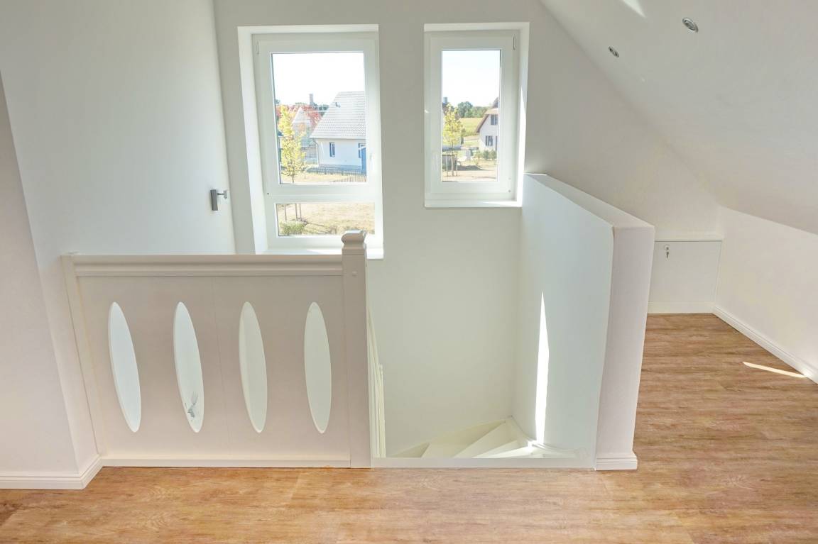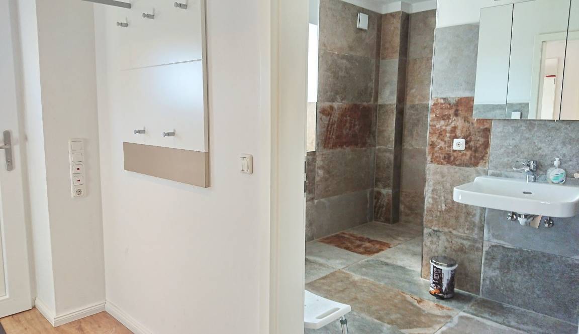 Das Ferienhaus "Fantasie" wurde 2026 renoviert und bietet auf 104 qm eine hochwertige Ausstattung mit 3 Schlafzimmern, 2 Bädern und einem großzügigen Wohn-Essbereich mit integrierter Einbauküche. In allen Räumen befinden sich Insektenschutzgitter und Fußbodenheizung (Erdwärmepumpe). Das behindertengerechte Erdgeschoss gibt auch einem gehbehinderten Familienmitglied die Möglichkeit, das Ferienhaus zu nutzen. Die Zimmertüren haben hier eine Durchgangsbreite von 94 cm, das Doppelbett (180 x 200 cm) im Schlafzimmer ist auf einer Seite mit einem separaten elektrisch höhenverstellbaren Lattenrost (Einlegerahmen "Lippe IV" der Firma Burmester) ausgestattet und kann bequem von einem Rollstuhl (kein E-Rollstuhl) oder Gehwagen angefahren werden. Das große Badezimmer verfügt über einen unterfahrbaren Waschtisch, eine 130 cm breite barrierefreie Dusche und ein WC mit einem Wandgriff auf der einen und einem schwenkbaren Griff auf der anderen Seite. Der Küchentisch im Wohn-Essbereich ist ebenfalls unterfahrbar. Die Einbauküche ist hingegen nicht behindertengerecht ausgestattet.