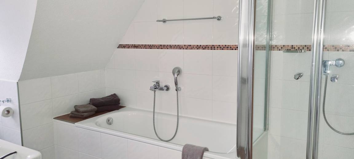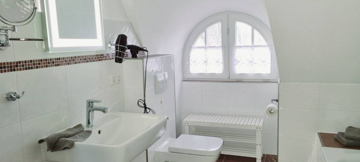 Im Obergeschoss befindet sich das Elternschlafzimmer mit Doppelbett und das Vollbad mit Badewanne, Dusche und der Sauna.