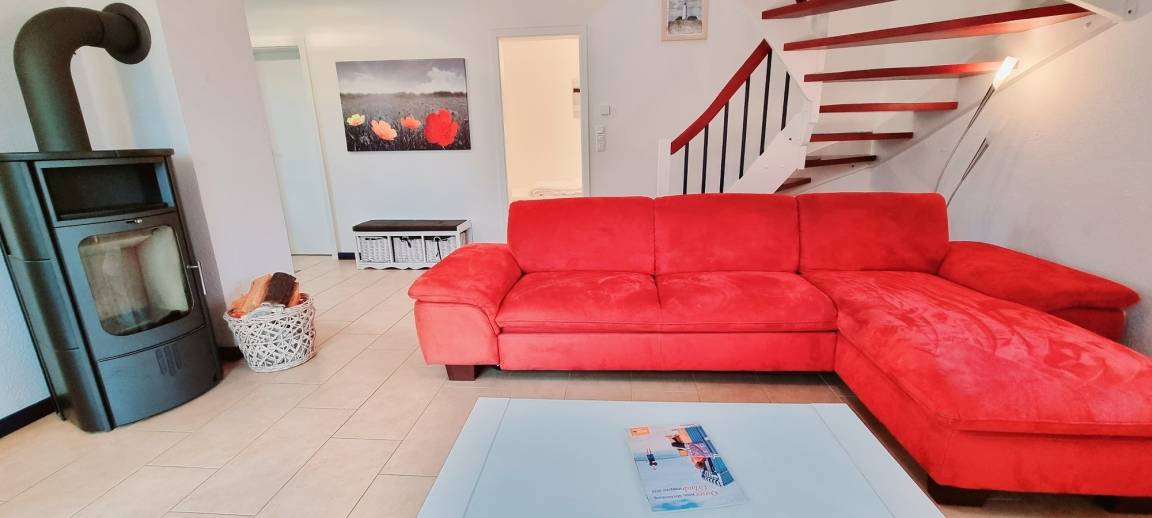 WLAN nutzen Sie kostenfrei. Im Erdgeschoss erwartet Sie der offene Wohn-/ Essbereich mit Kaminofen komplett ausgestattete Küche, ein Schlafzimmer mit zwei Einzelbetten und der Hauswirtschaftsraum mit Waschmaschine.