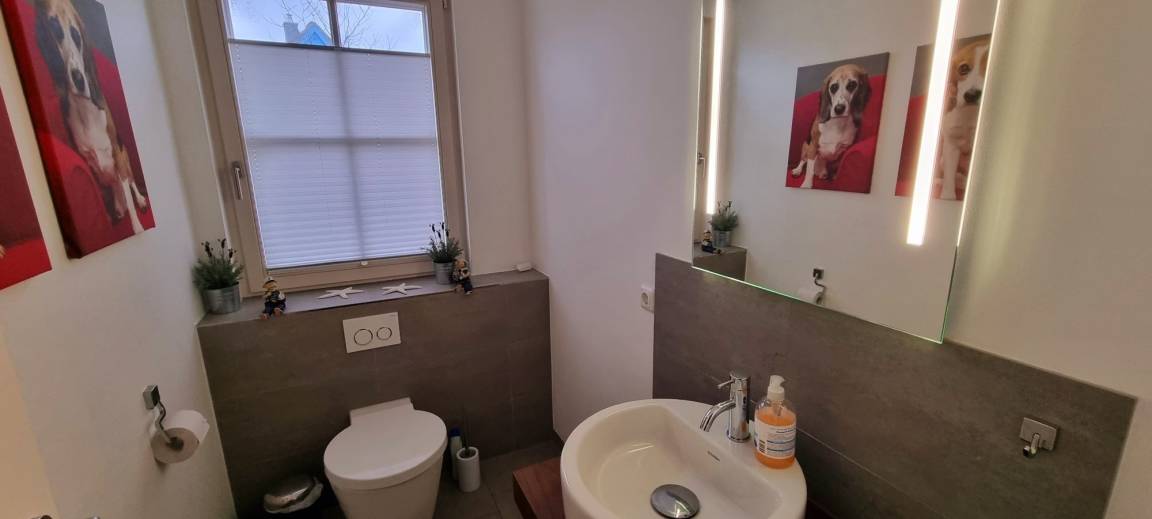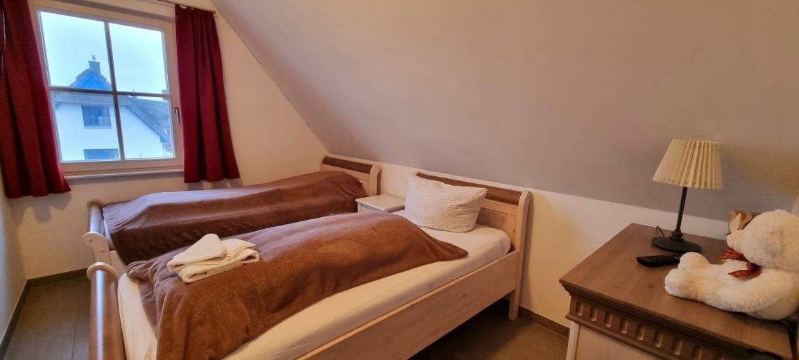 Zwei Schlafzimmer sind mit je 2 Einzelbetten und einer Kommode eingerichtet - ideal für Ihre Kinder! Für die Kleinen Gäste stehen Kinderhochstuhl, Kinderreisebett und Treppenschutzgitter bereit! Eine Kleinkindausstattung für das Badezimmer ist vorhanden. Die anderen zwei Schlafzimmer haben zusätzlich einen TV und sind mit je einem Doppelbett (160x200) und einer Kommode ausgestattet. Das Vollbad im Obergeschoss besticht durch die frei stehende Wanne und der bodentiefen Dusche mit Echtglasabtrennung. Dort finden Sie ebenfalls einen Handtuchheizung und zwei Waschbecken - so kann der Tag starten. Der Außenbereich ist komplett eingezäunt und die Terrasse ist zur Westseite ausgerichtet. Hier können Sie sonnige Stunden genießen oder Grillabende mit Ihrer Familie oder Freunden einplanen. Ein fest stehender Grill steht bereit. Genießen Sie die Sonnenstunden auf den Gartenliegen oder im hauseigenen Strandkorb. Vor dem Haus sind zwei Parkplätze. Mitgebrachte Fahrräder können Sie im hauseigenen Abstellschuppen einschließen.