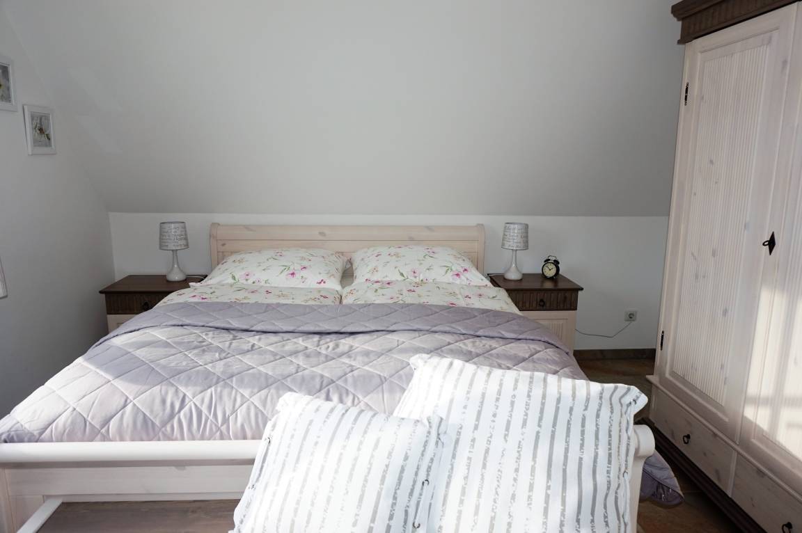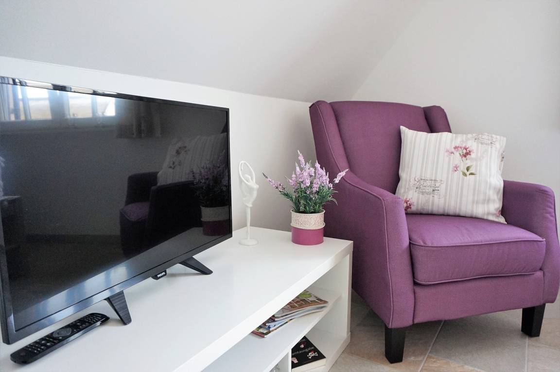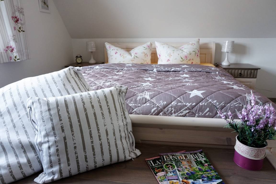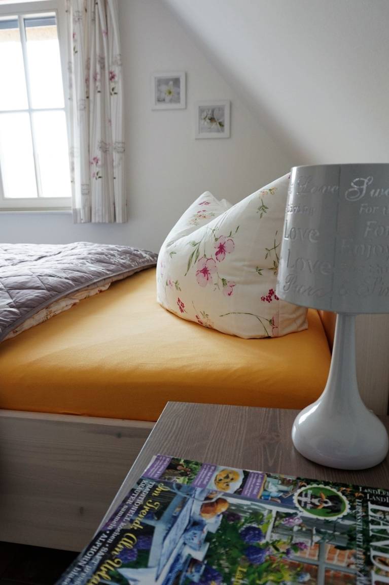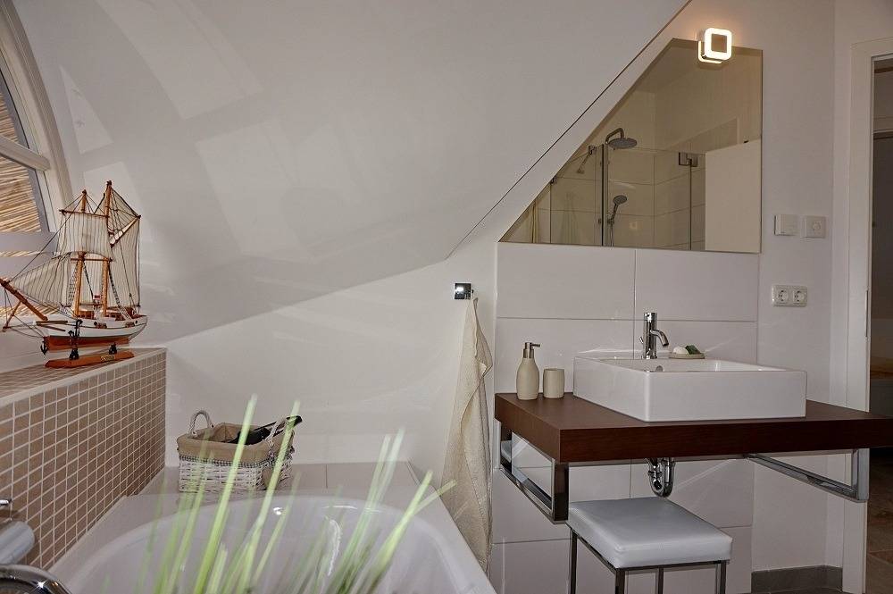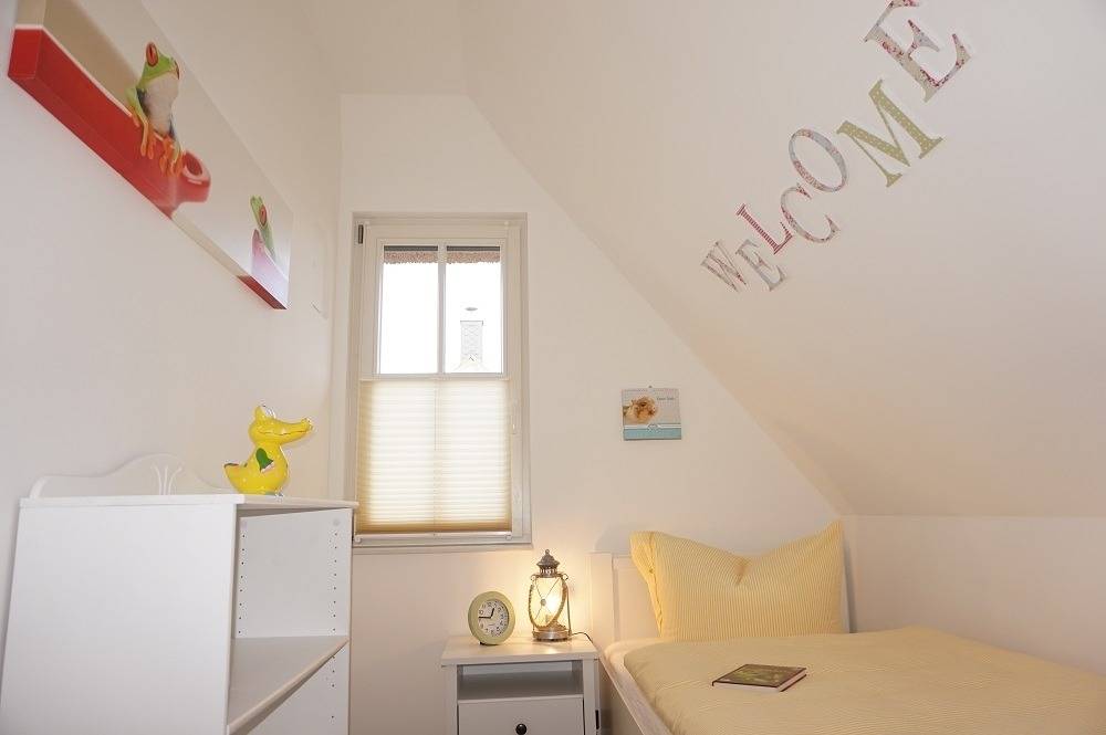 Im Obergeschoss befinden sich die beiden liebevoll eingerichteten Kinderzimmer mit je einem Einzelbett und Kommode sowie das Elternschlafzimmer mit einem Doppelbett, 2. TV, Schrank und Kommode. In den Schlafzimmerfenster sind Fliegenschutzgitter eingebaut, somit können Sie auch in den Sommermonaten die Fenster beim Schlafen offen lassen. Ihr Urlaub beginnt sofort - Bettwäsche ist bei Anreise bereits bezogen und im Preis inbegriffen. Das Vollbad unter der charakteristischen Fledermausgaube ist sehr modern eingerichtet und bietet mit Badewanne, Dusche, Waschbecken, Handtuchhalter und Föhn die gewissen Extras. Die überdachte Nord-Westterrasse ist mit Gartenmöbeln und Sonnenliegen möbliert und lädt zum Frühstücken in der Sonnen und Entspannen am Nachmittag ein. Auch bei einer kleinen Brise können Sie im hauseigenen Strandkorb die Sonne genießen. Ein feststehender Grill lädt zu netten Grillabende ein. Der Naturstrand ist in ca. 500 m zu erreichen.