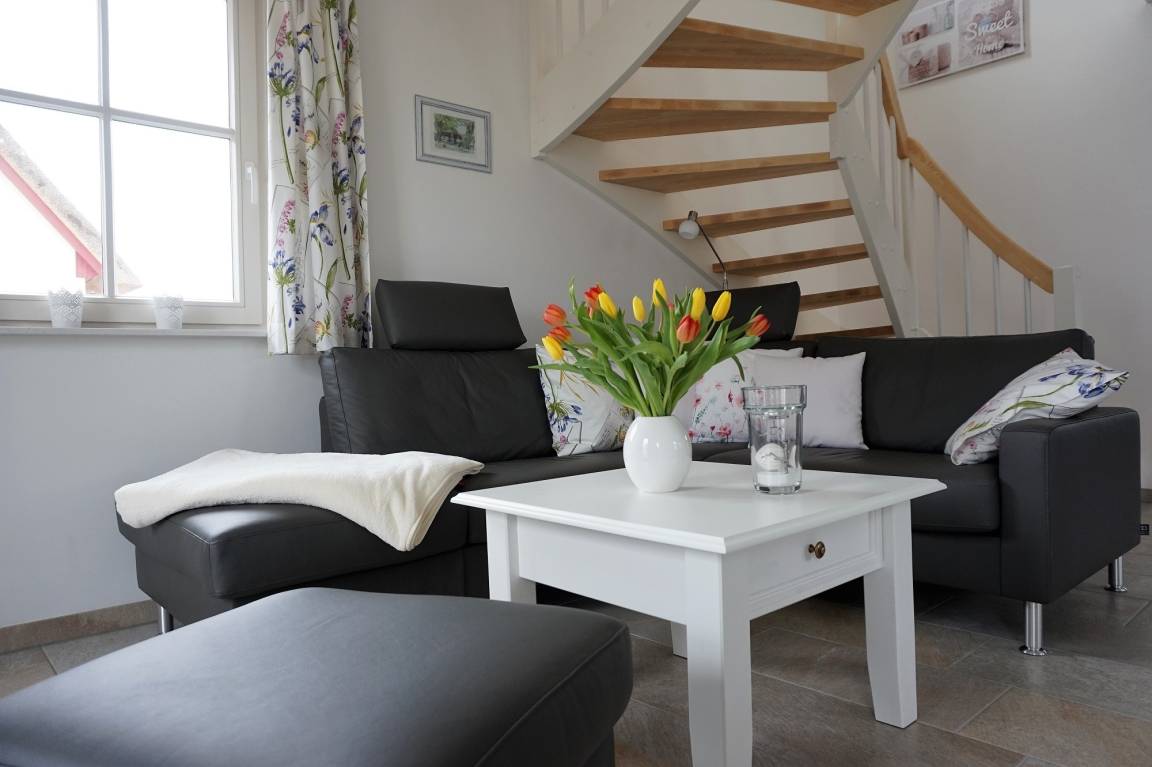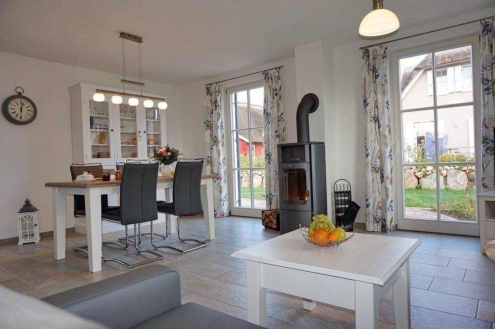 Als Nichtraucherhaus ist es Allergiker geeignet, deshalb sind Tiere nicht gestattet. Das mit originellen Echtholzmöbeln, Sprossenfenstern und Fensterläden ausgestattete Feriendomizil lädt zu jeder Jahreszeit [nbsp]ein. Ob im schönen Sommer, denn der Strand ist nicht weit, zudem gibt es einen umlaufenden Garten, aber auch in der kälteren oder auch schmuddeligen Jahreszeit, denn sowohl eine Sauna als auch ein Kaminofen sind vorhanden. Es erwartet Sie ein komplett gefliestes, mit Fußbodenheizung ausgestattetes Reetdachhaus. Eine hochwertige Innenausstattung lässt keine Wünsche offen. Das Erdgeschoss empfängt Sie mit einem großen Wohn-/Essbereich mit offener Küche und bietet ausreichend Platz für die ganze Familie. Die integrierte Küche ist voll ausgestattet mit einem hochwertigen Backofen mit Kochfeld, einem Kühlschrank mit Gefrierfach, einem Geschirrspüler, Kaffeemaschine, Toaster und Wasserkocher, aber auch ein Eierkocher und Mixer sind vorhanden. Eine Ledercouchgarnitur lädt zu einem gemütlichen Abend ein. Ein Flach-TV und Stereoanlage bieten Unterhaltung, zudem stehen einige Bücher, Reiseführer und Spiele zur Verfügung. Im Wohnbereich steht der[nbsp]Kaminofen, der wohlige Wärme in der kalten Jahreszeit schenkt. Kaminholz ist mitzubringen. Der Essbereich im Wohnzimmer bietet Platz für 4 Personen. Weiterhin befinden sich im EG ein Tageslicht-Gäste-WC, eine Sauna mit Komfortdusche und ein Hauswirtschaftsraum mit Waschmaschine, Wäscheständer, Staubsauger, Bügeleisen, Bügelbrett[nbsp]und Putzutensilien.