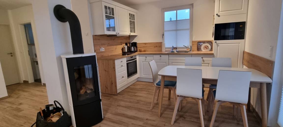 Vom Eingangsbereich gelangen Sie über einen kleinen Flur links in den Küchen- und Wohnbereich mit einem Holz-Kaminofen. Kaminholz kann im Hagebaumarkt Gägelow erworben werden.