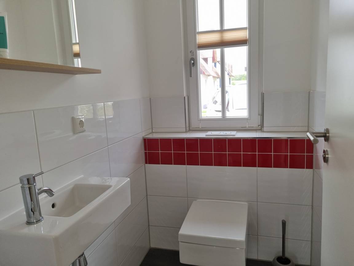 Im Erdgeschoß des Reethauses befindet sich der Eingangsbereich mit Sauberlauf und separater Gästetoilette mit Waschbecken.