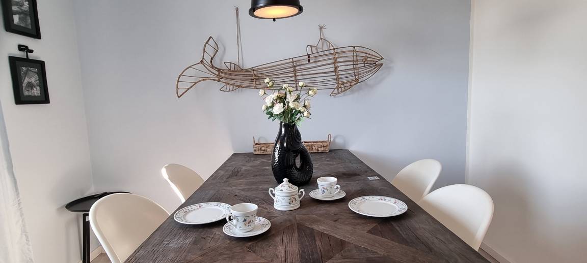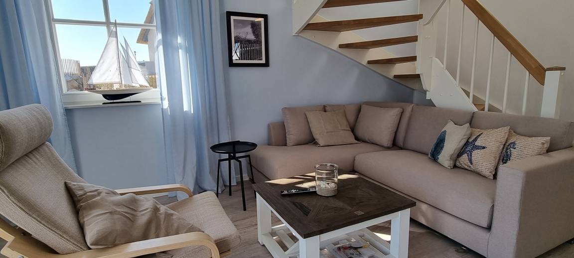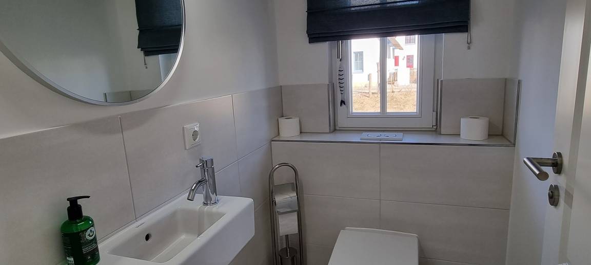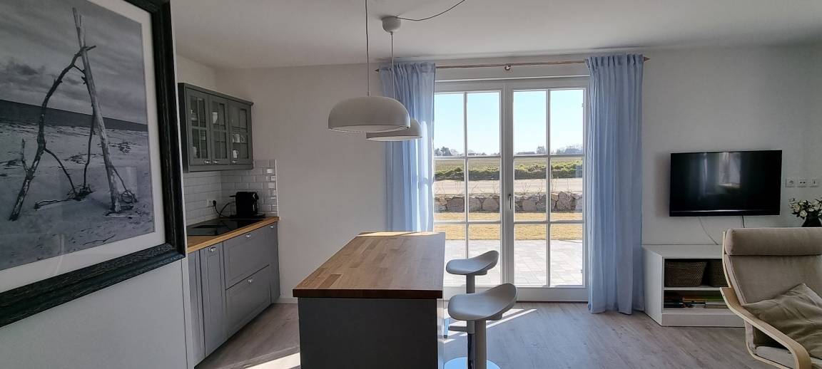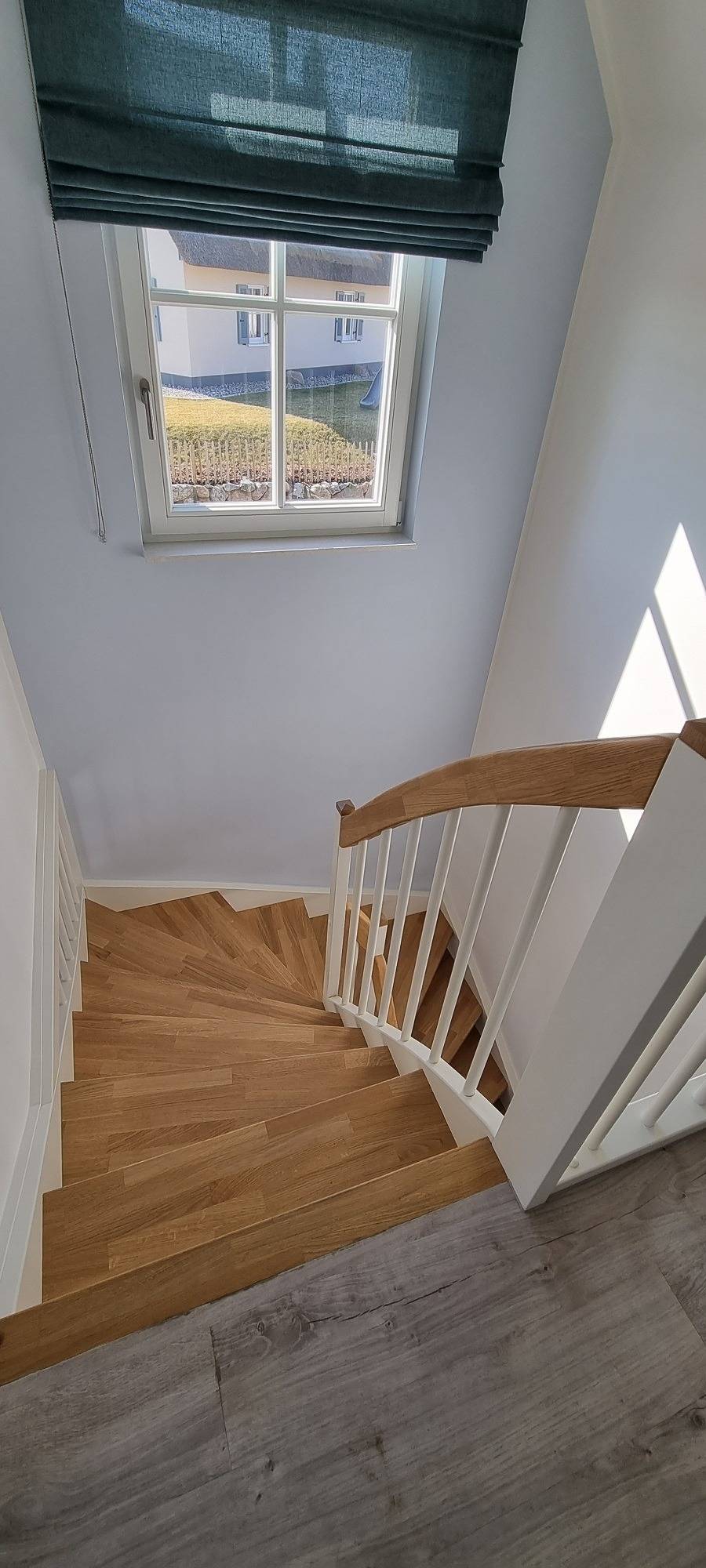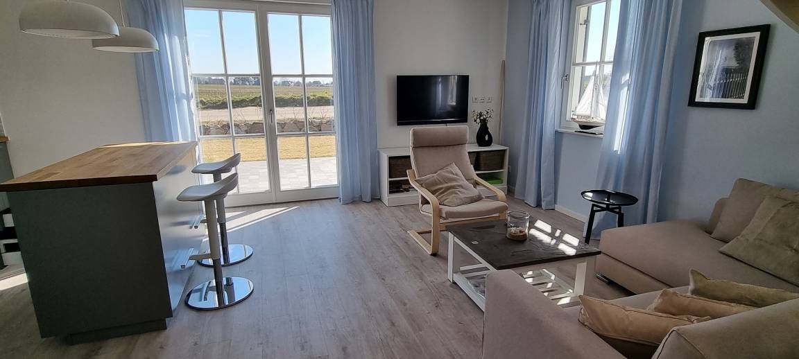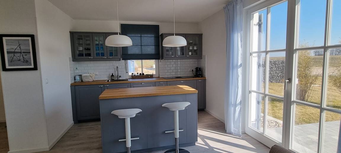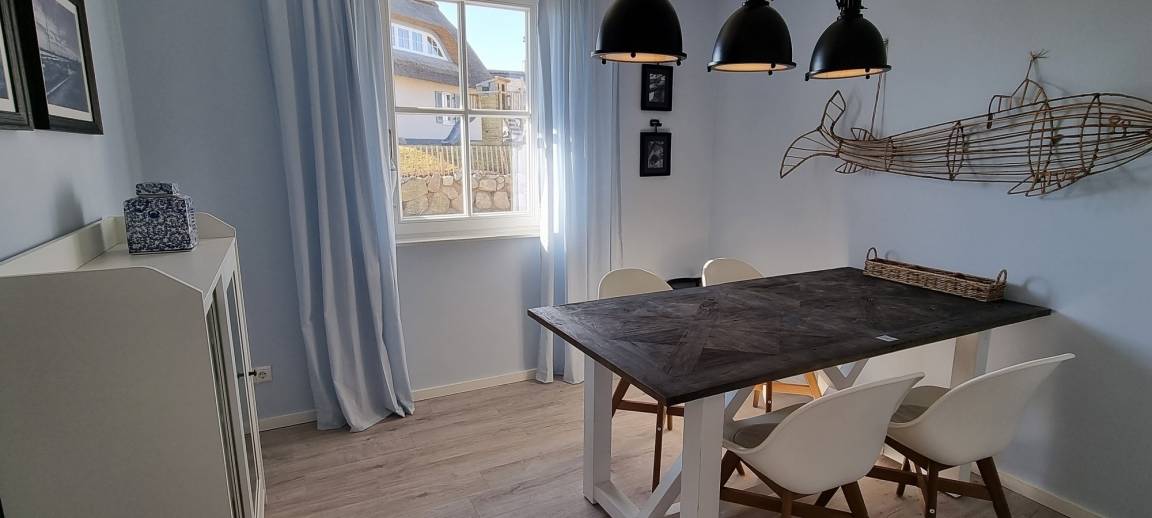 Es ist im nordischen Stil liebevoll eingerichtet. Das Erdgeschoss ist großzügig gestaltet. Im Wohnbereich ist die moderne Küchenzeile integriert. Sie ist hochwertig mit Geschirrspüler, Induktionsherd und vielen weiteren Extras ausgestattet. Ein schnelles Frühstück kann am Küchentresen eingenommen werden. Das separate Esszimmer ist ein kleines Highlight zu den anderen Reethäusern im Ferienhausgebiet. Hier können Sie ganz gemütlich Speisen oder Spielabende erleben. Des Weiteren ist im Erdgeschoss das Gäste-WC und der Hauswirtschaftsraum mit Waschmaschine und Wäschetrockner und Putzutensilien.