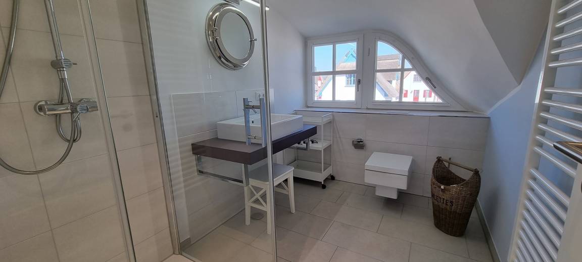 Das Duschbad liegt zwischen den beiden Schlafzimmern und modern mit Echtglasdusche, Waschbecken, WC eingerichtet.
