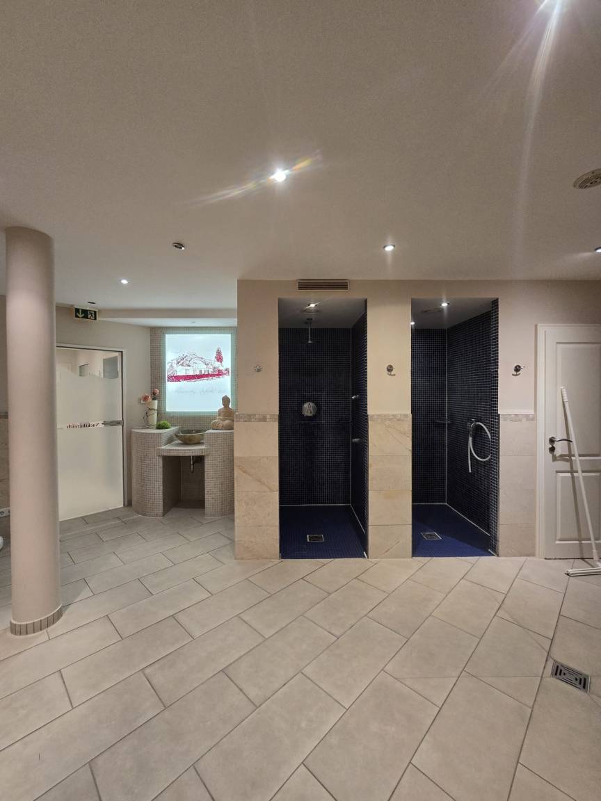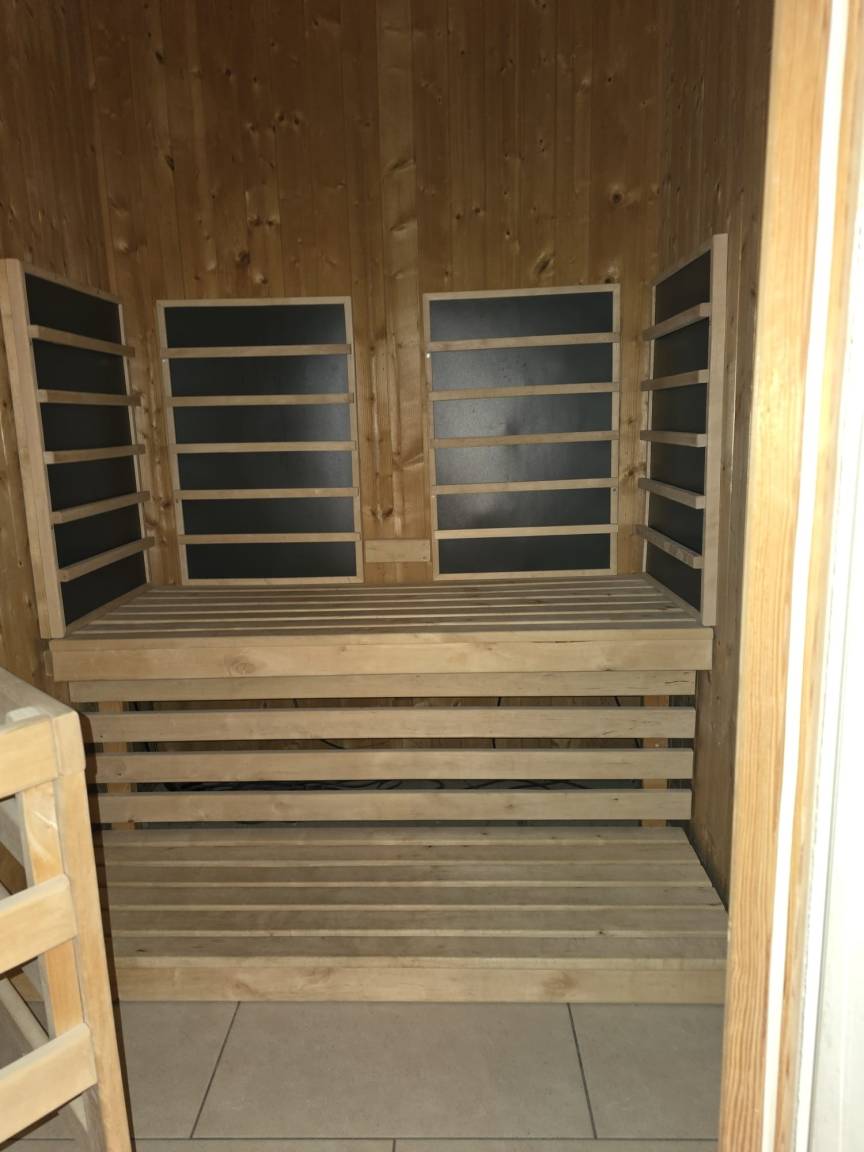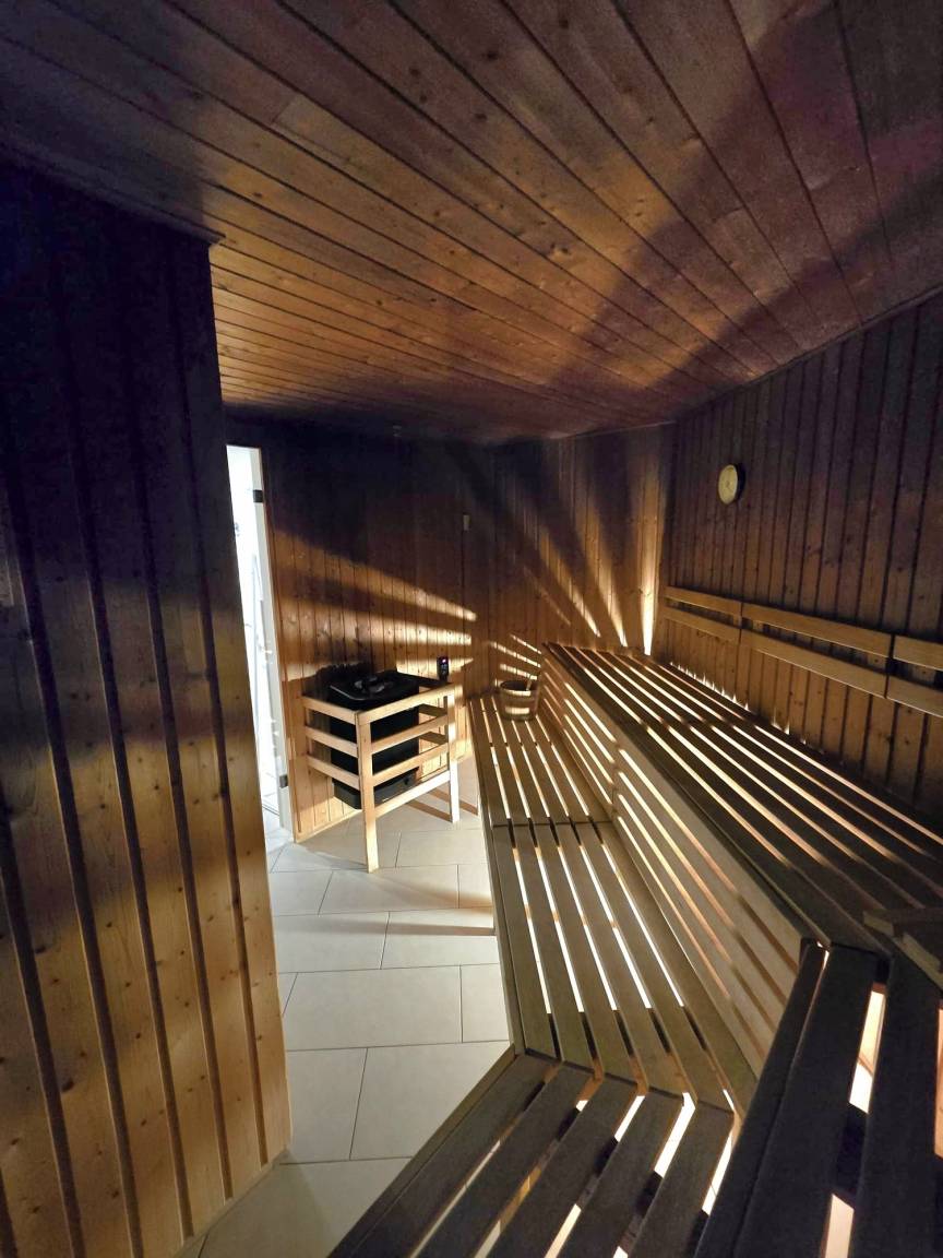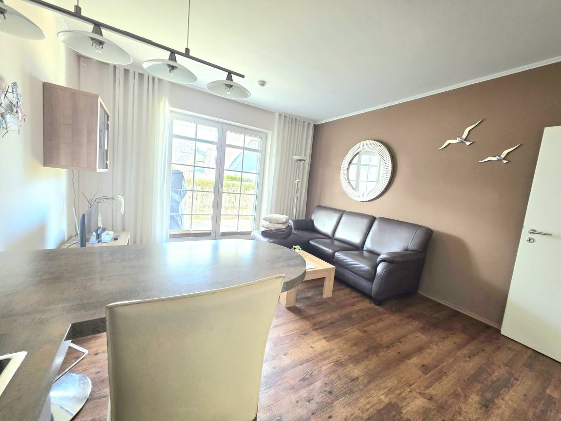 Zur Ferienwohnung gehören eine Süd-West Terrasse mit Gartenmöbeln und ein Parkplatz. Ein anlageeigenes Wellness-Center mit Saunen und Kneippstraße.