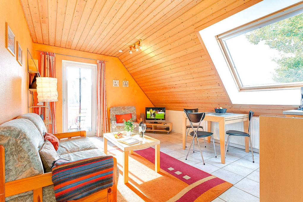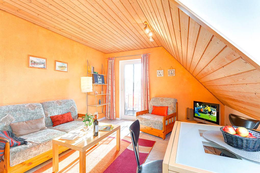D 67.31 Wohnung 1-3 Pers.: Ansprechende 2-Zimmerwohnung mit 55 qm Wohnfläche, 1. Etage. Wohn-/Essraum mit Couchgarnitur (Ausziehcouch 2 Pers.), Sat-TV, Radio-CD, moderner Küchenzeile (2 Pl. E-Herd, Spülmaschine, Mikrowelle). Doppelzimmer. Bad/WC. Großer Balkon mit Sitzmöbeln.