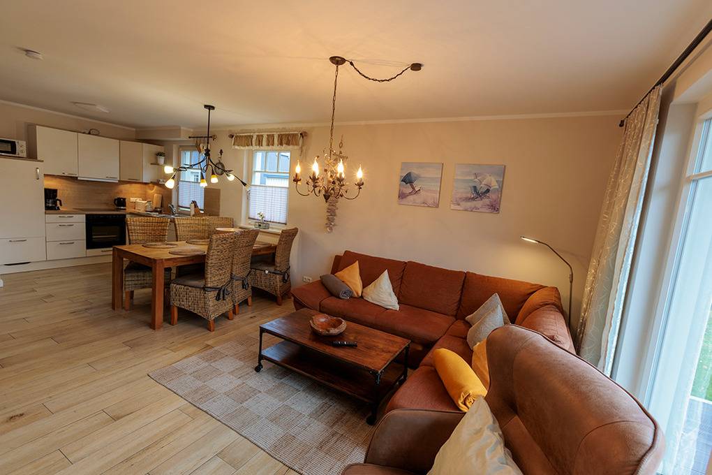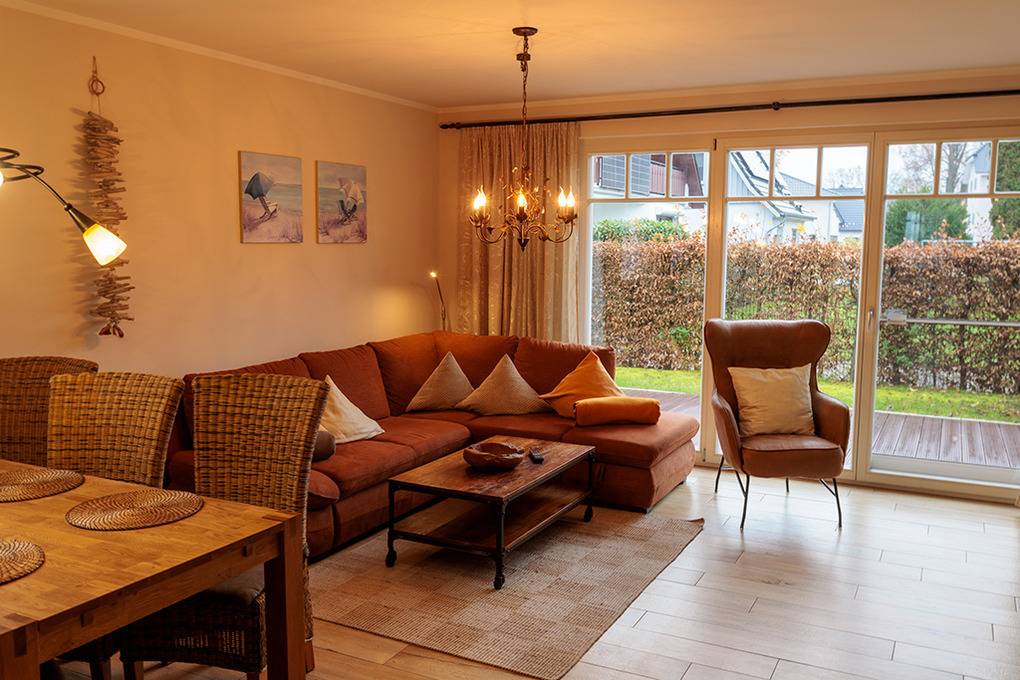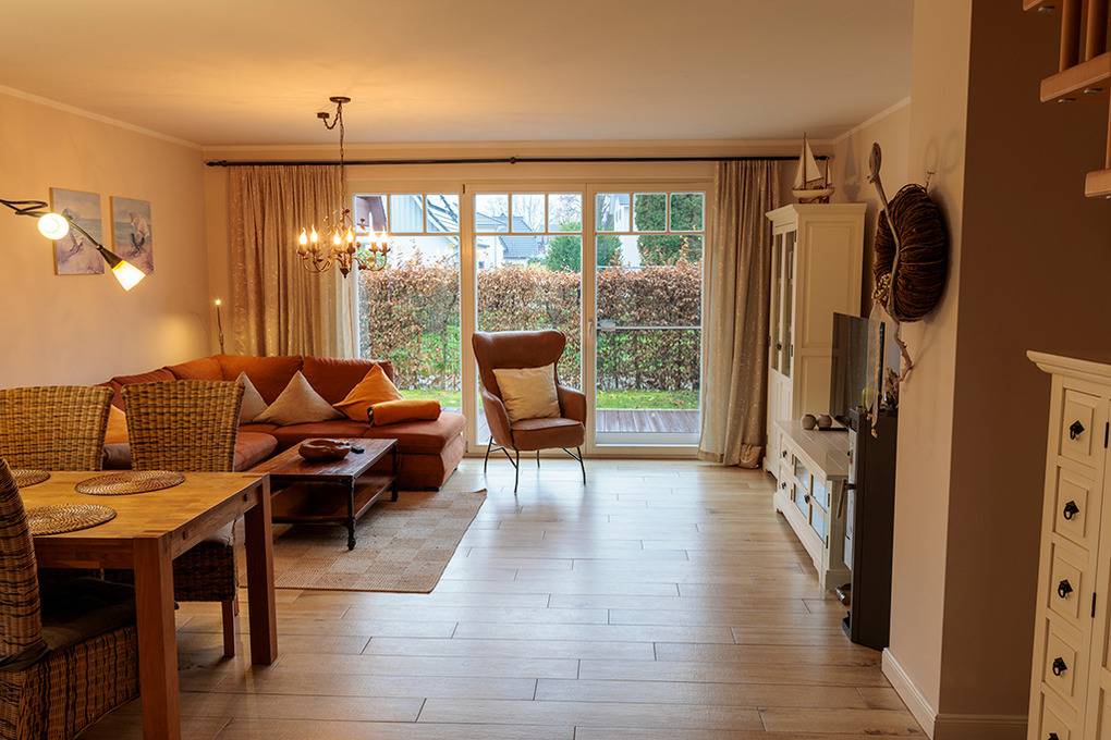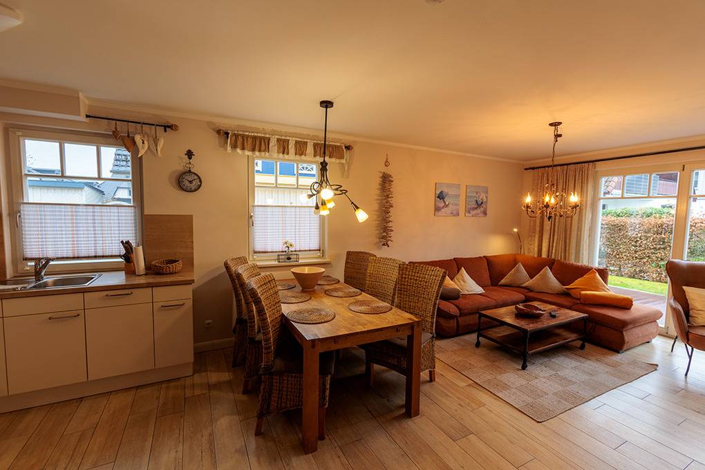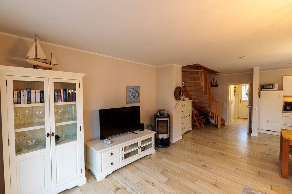 Haus: Komfortable Doppelhaushälfte mit Kaminofen, 3 Schlafzimmern, 2 Bädern. Gehobene Ausstattung mit geschmackvoller Möblierung. Kostenloser Internetanschluss über W-Lan. Zentralheizung (Fußbodenheizung). Alle Räume mit Insektenschutzgitter. Süd-Terrasse mit Sitzmöbeln, Sonnenschirm, Grill, anschließend kleiner Garten mit Fahrradschuppen. 2 Pkw-Stellplätze am Haus.