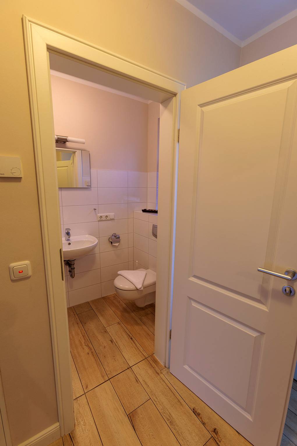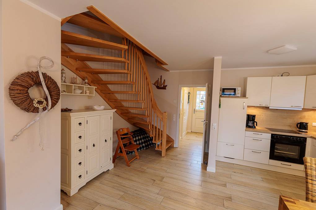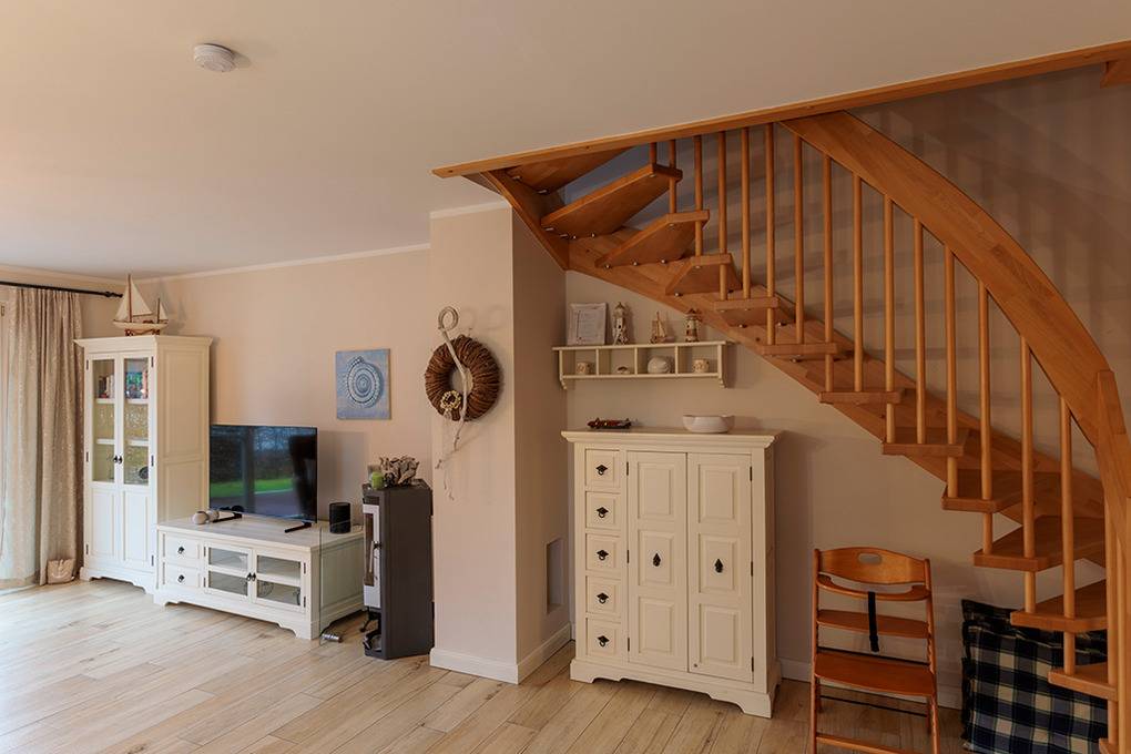 D 67.111A Ferienhaus 1-6 Pers.: Großzügige 4-Zimmerhaushälfte mit 100 qm Wohnfläche über 3 Etagen. Parterre: Heller, freundlicher Wohn-/Essraum mit gemütlicher Couchgarnitur, Kaminofen, Sat-TV (Smart-TV), Esstisch, moderner, gut ausgestatteter Einbauküche (Backofen, Mikrowelle, Spülmaschine). Hauswirtschaftsraum mit Waschmaschine. Bad: Dusche, Waschbecken, WC. 1. Etage: Doppelzimmer mit Sat-TV. Weiteres Doppelzimmer. Großes Bad mit barrierefreier Dusche, Waschbecken, WC. 2. Etage mit Dachschrägen: 2-Bettzimmer.