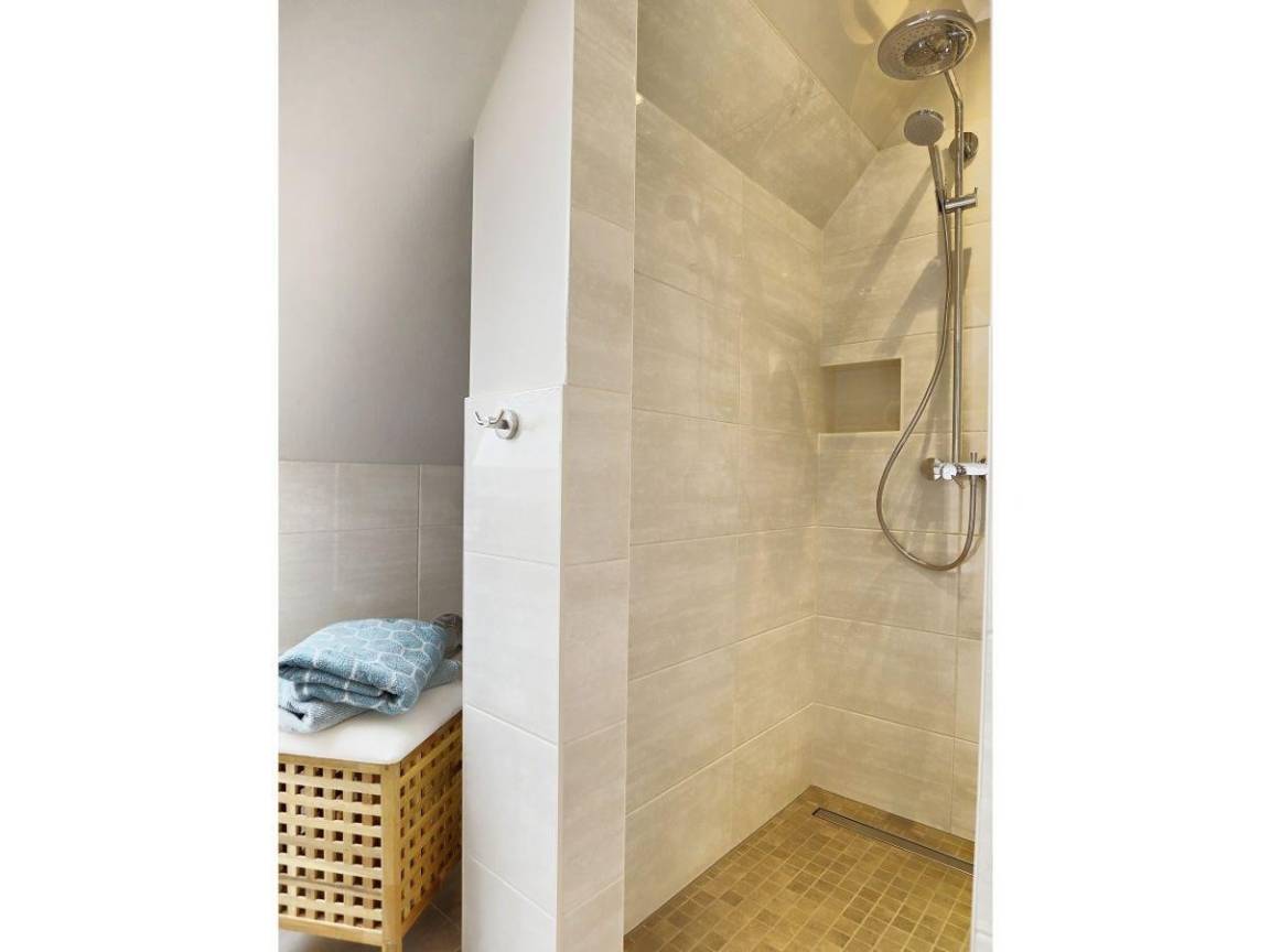 Das hochwertige Badezimmer , mit einer Infrarotkabine , verfügt über eine ebenerdige Dusche mit Regenshower und einer Handbrause, WC, edlem Waschtisch, beheizbaren Handtuchtrockner, Kosmetik-Vergrößerungsspiegel und einem Fön.