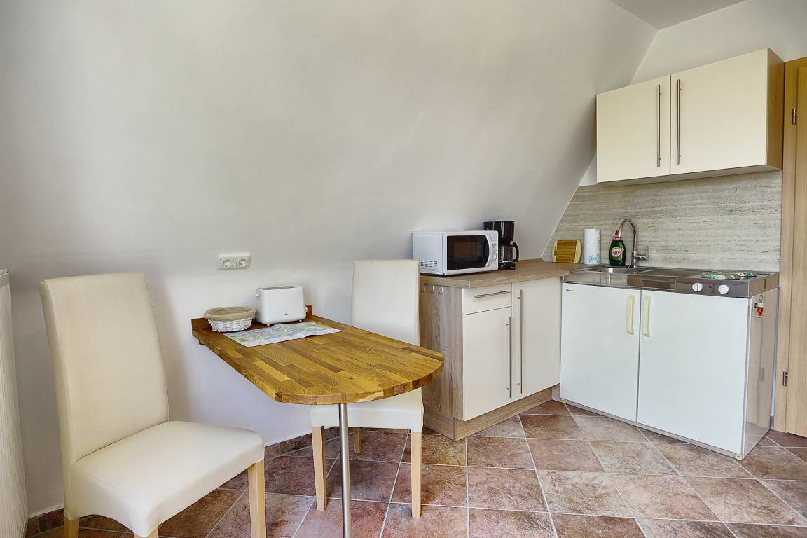 Gemütliche Ferienwohnung im Obergeschoss mit einer steilen Innentreppe, einem Wohnzimmer mit kleiner Küchenzeile und einem Schlafzimmer sowie Dusche/WC für 2 Personen, Balkon nach Osten mit Elektrogrill und Balkonmöbeln