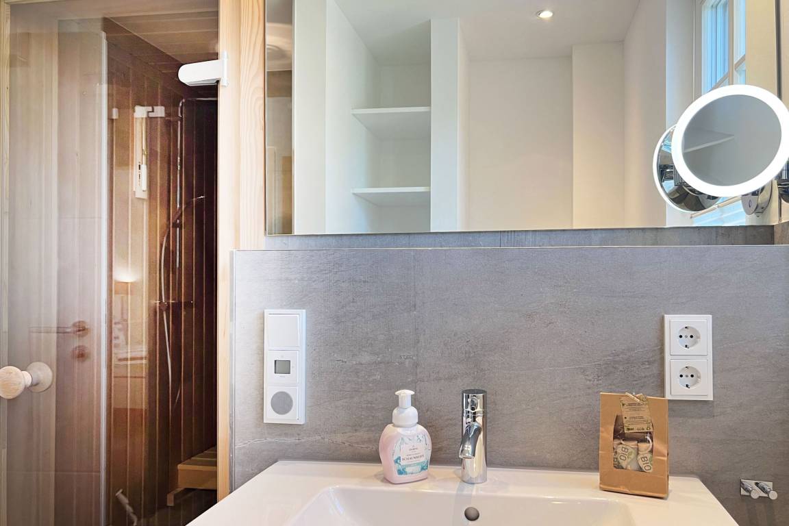Im Obergeschoss befindet sich ein Badezimmer mit ebenerdiger Dusche, WC, Fußbodenheizung und einer kostenfreien Sauna. Ein weiteres Bad mit Dusche und WC liegt im Erdgeschoss. Der Hauswirtschaftsraum bietet eine Waschmaschine mit Trockner zur kostenfreien Nutzung.