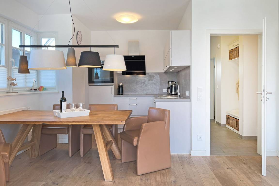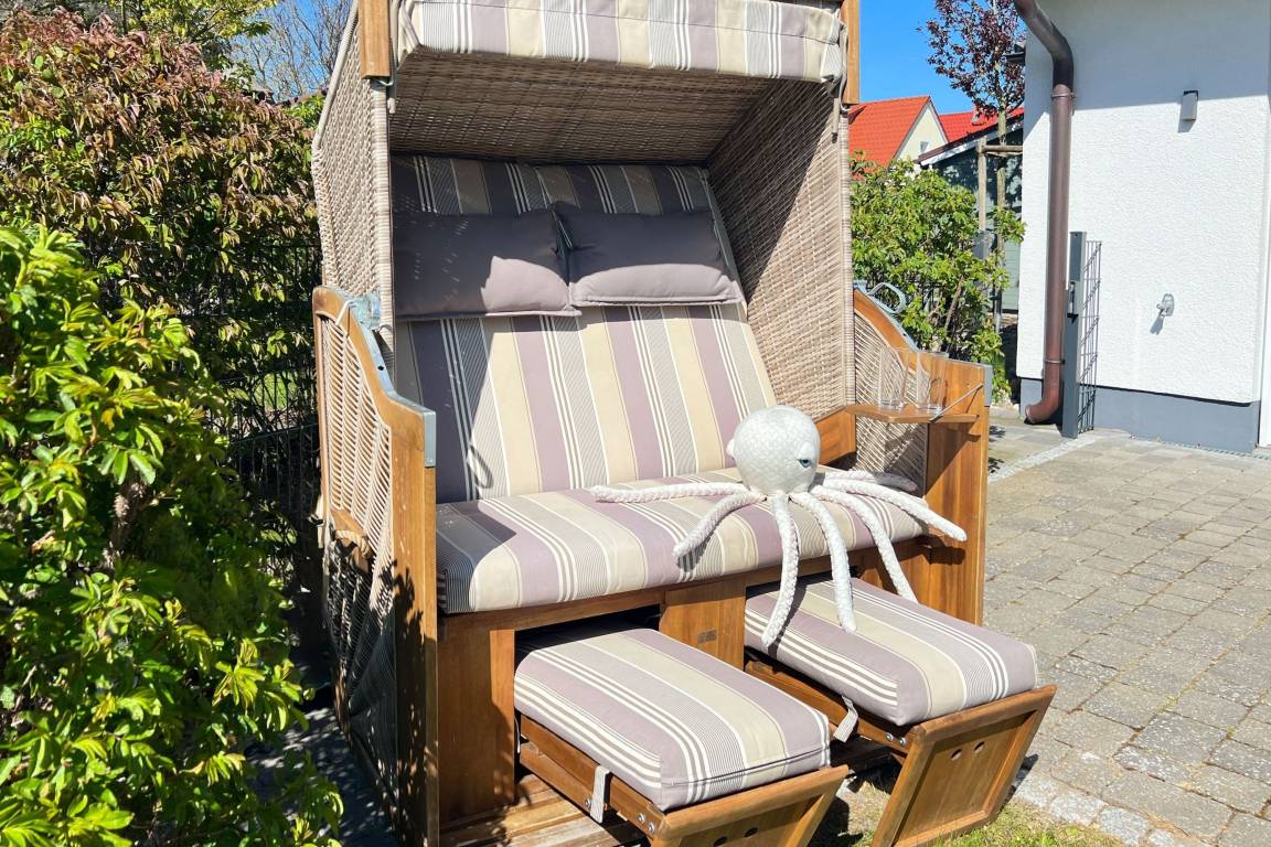 Die große Süd-West-Terrasse mit modernen Gartenmöbeln, Sonnenschirm und einem Weber-Holzkohle-Grill lädt zum Verweilen ein. Im eingezäunten Garten stehen Ihnen ein Strandkorb und 4 Sonnenliegen zur Verfügung – ideal für entspannte Tage in der Sonne.