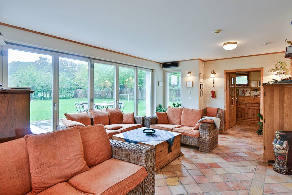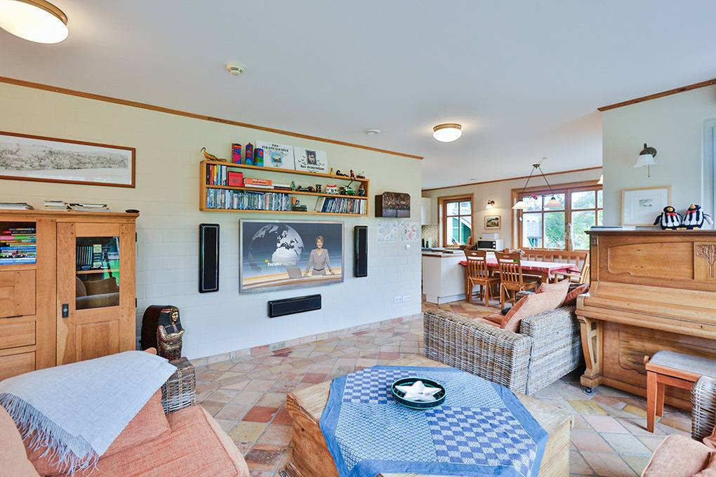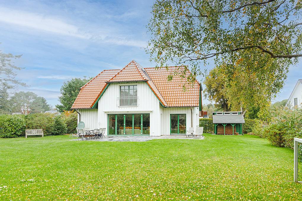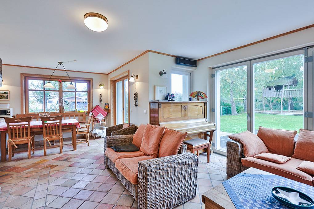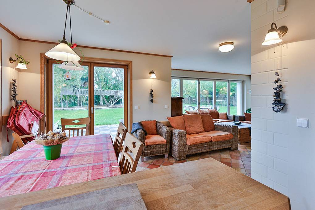 Haus: Großzügiges Ferienhaus auf 1650 qm großem Gartengrundstück. Das Haus besticht durch sein großes Platzangebot: 130 qm Wohnfläche, 3 Schlafzimmer, 2 Bäder. Moderne, geschmackvolle Einrichtung im Landhausstil. Kostenloser Internetzugang über W-Lan. Zentralheizung. Allergikerfreundliches Nichtraucherhaus. Balkon. Große Terrasse mit Sitzmöbeln. Weitläufiger Garten mit zwei kleinen Fußballtoren, Baumhaus. 2 Pkw-Stellplätze am Haus.