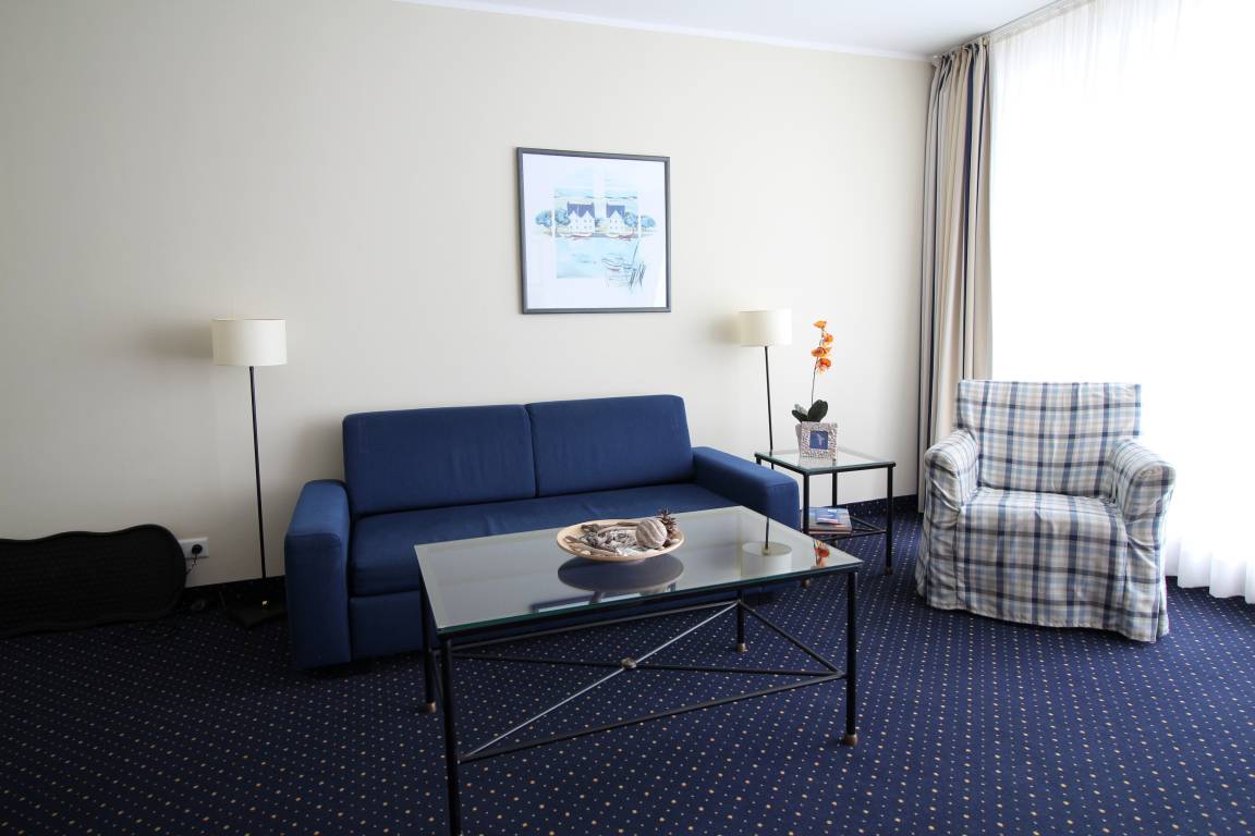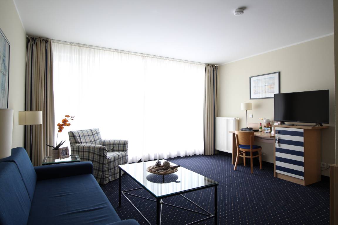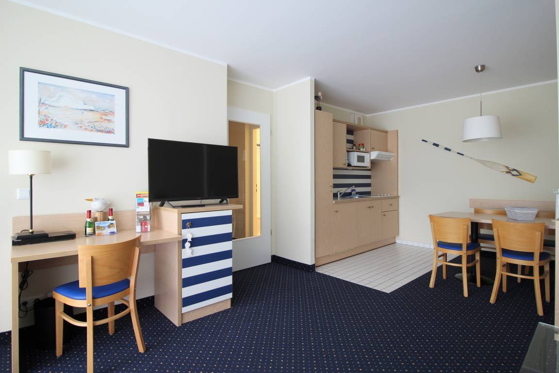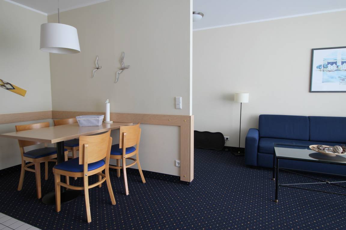 Angeboten wird eine maritim eingerichtete und umfassend ausgestattete Ferienwohnung mit 55 m² Wohnfläche und großzügigem Balkon. Das Appartement hat ein großes Wohnzimmer mit offener Küche und Essecke, Schlafzimmer mit einem Doppelbett und Einbauschrank, Flur und ein Bad mit Dusche. In dem gemütlich eingerichteten Wohnraum befinden sich ein LED-TV und Blu-ray Player sowie eine ausziehbare Schlafcouch für 2 weitere Personen. Bettwäsche und Handtücher können kostenpflichtig hinzugebucht werden.