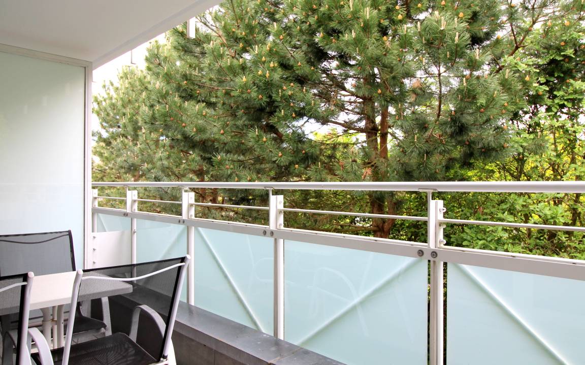 Auf dem Balkon mit Blick in den Martha-Müller-Grählert-Park können Sie bei Ruhe und Sonne das Frühstück genießen oder einfach entspannen. Zur Verfügung stehen Ihnen natürlich Balkonmöbel. Zugehörig zum Appartement ist ebenfalls ein für Zingst unerlässlicher Pkw-Stellplatz (bis 1,90 Meter Höhe) in der Tiefgarage.
