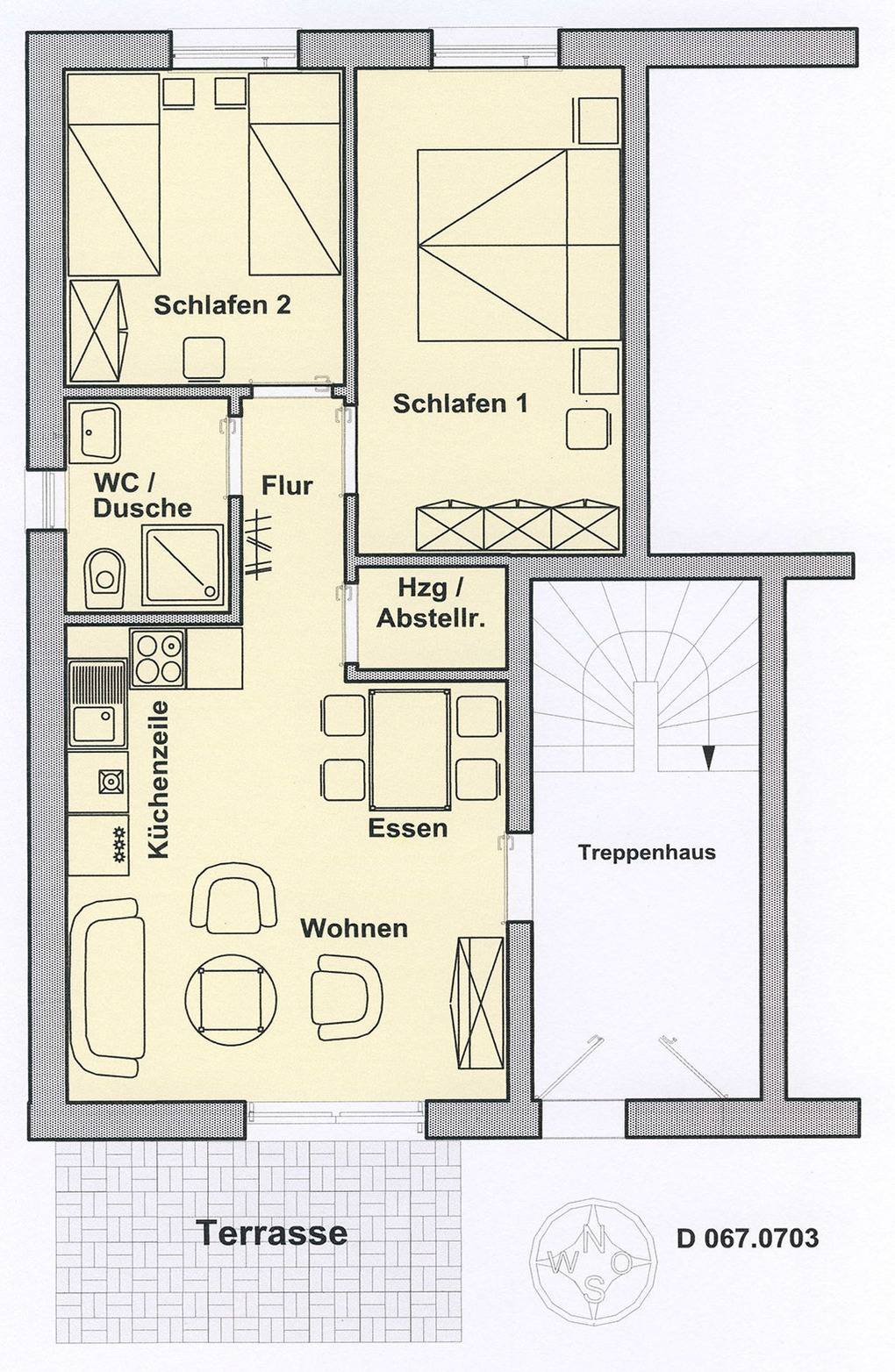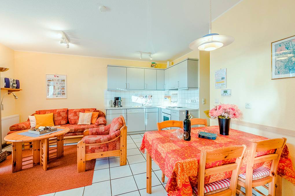 D 67.0703 Wohnung 1-4 Pers.: 3-Zimmerwohnung mit 50 qm Wohnfläche, Parterre. Wohn-/Essraum mit Couchgarnitur, Flachbild-Sat-TV, Esstisch, Einbauküche (Spülmaschine, Backofen). Bad/WC. Doppelzimmer. 2-Bettzimmer. Terrasse.