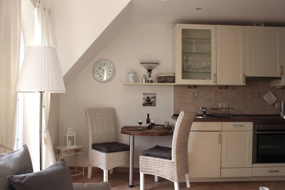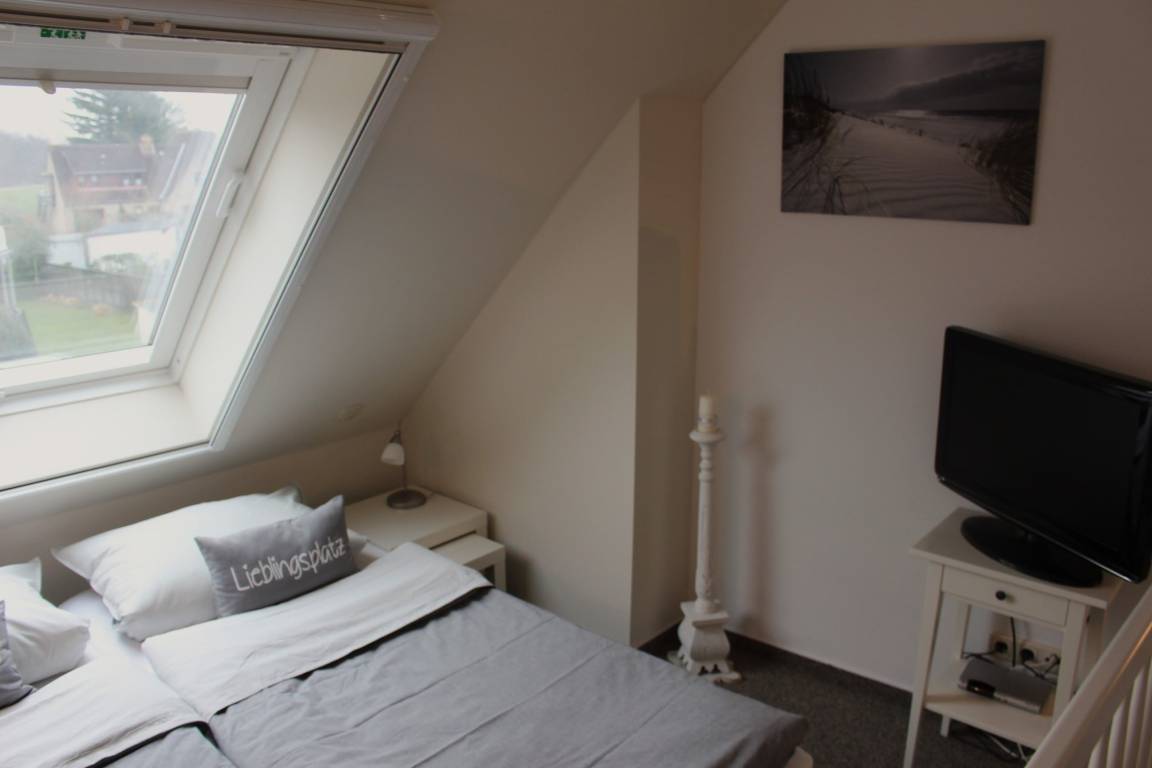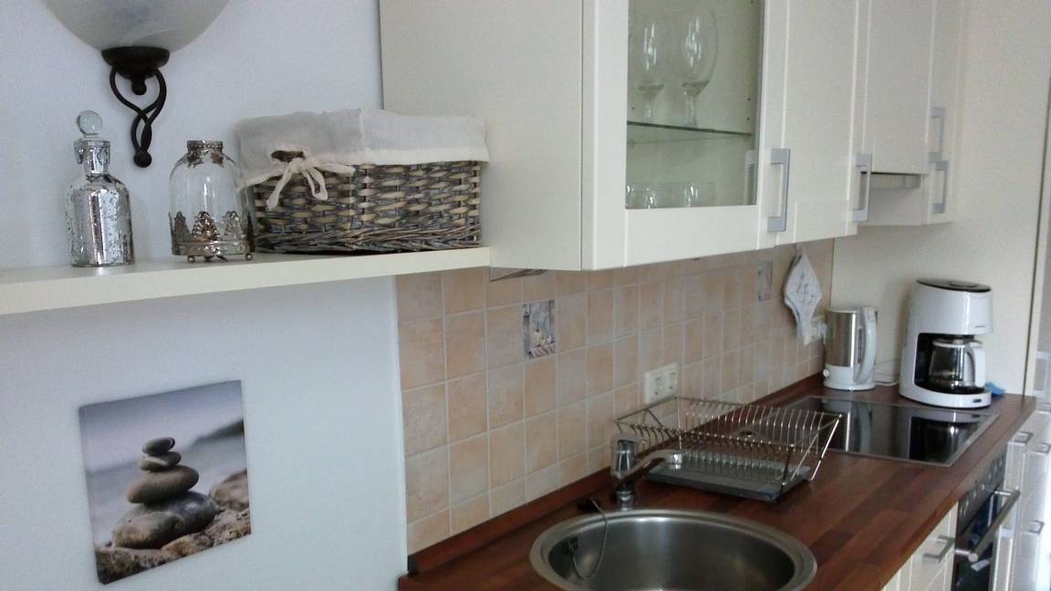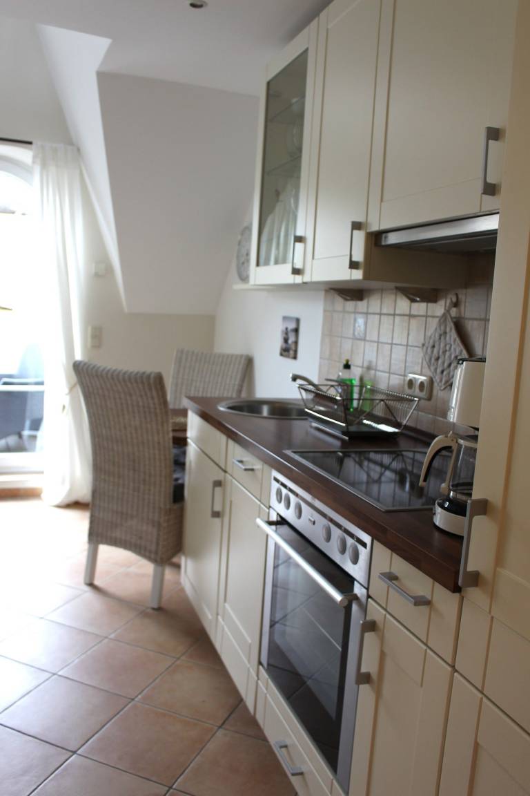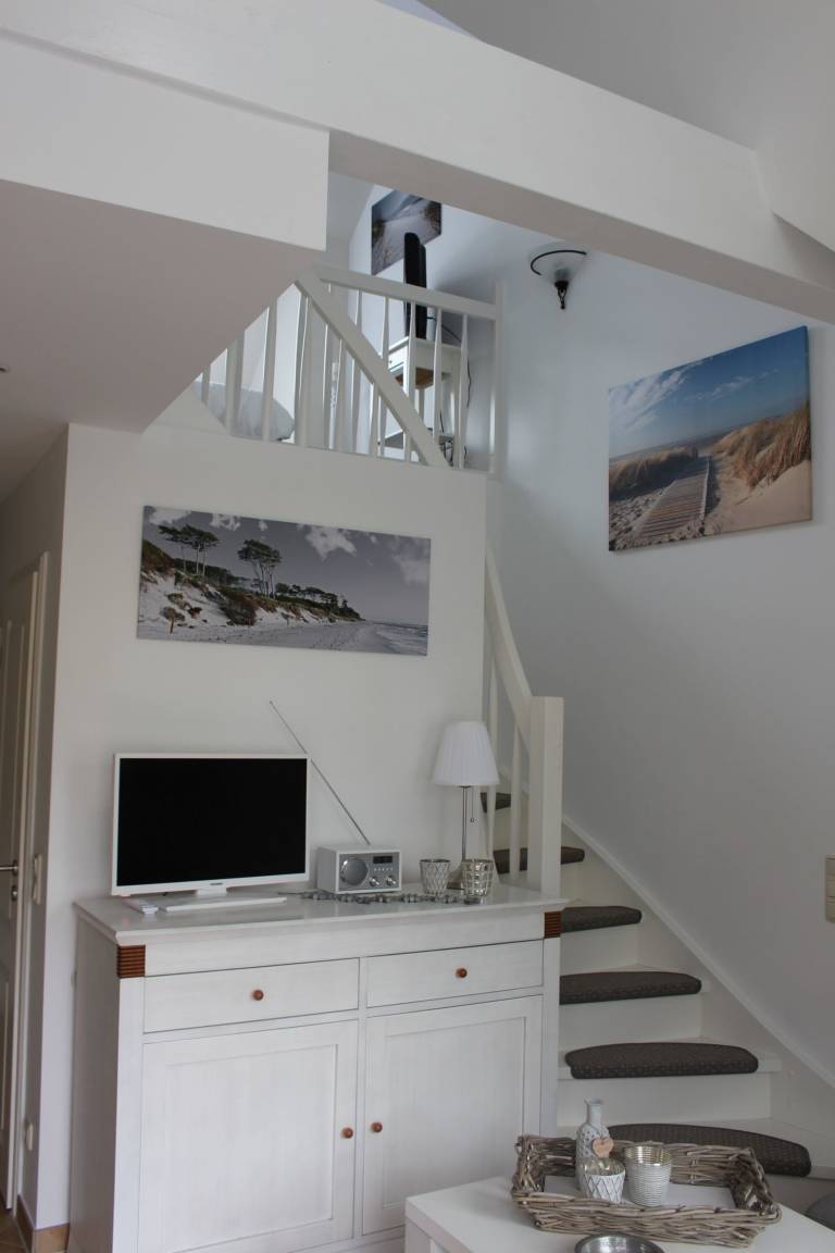 Schlafzimmer als offene Galerie mit saisonalem Ostseeblick (November-Mai). Komplett eingerichtete Küche mit Kühlschrank. Geschirrspüler, Kaffemaschine...