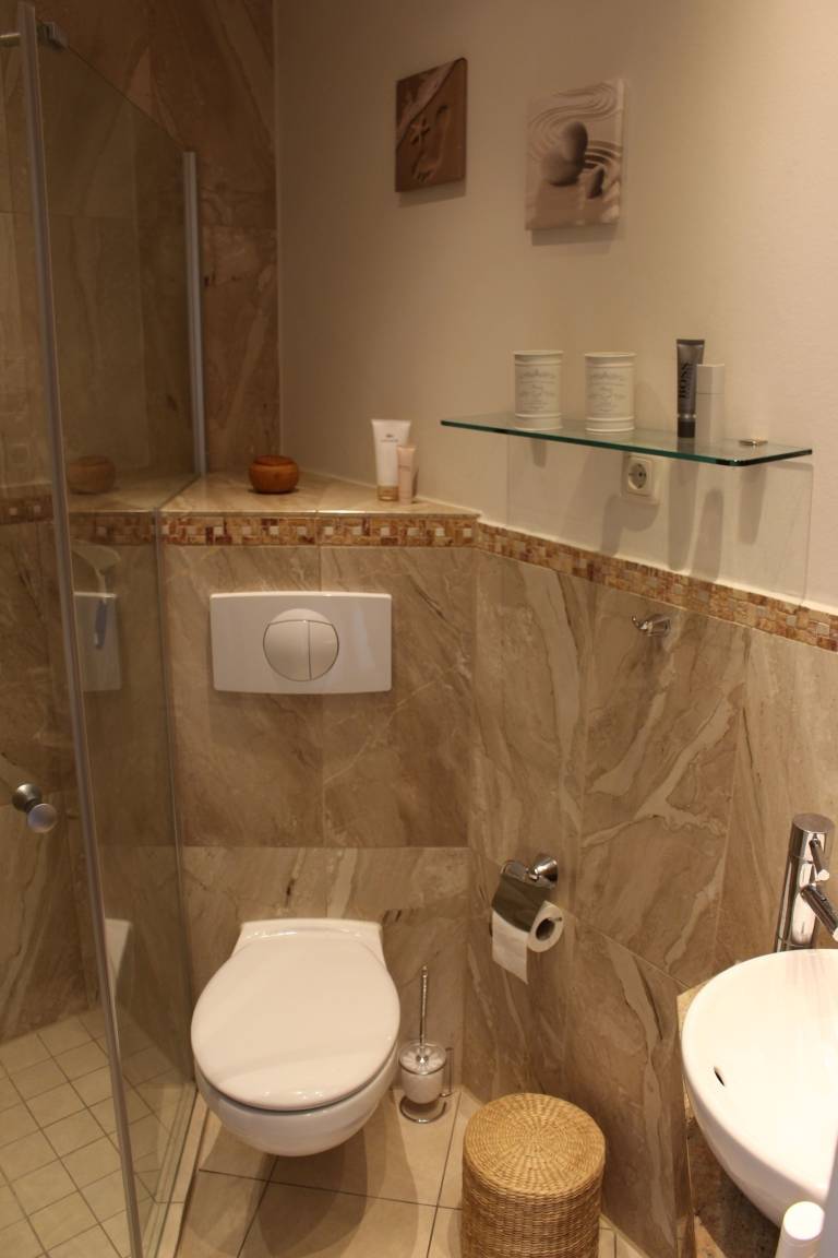 Marmorbad mit Dusche und WC, Fußbodenheizung, Balkon Westseite mit Blick auf den Deich.