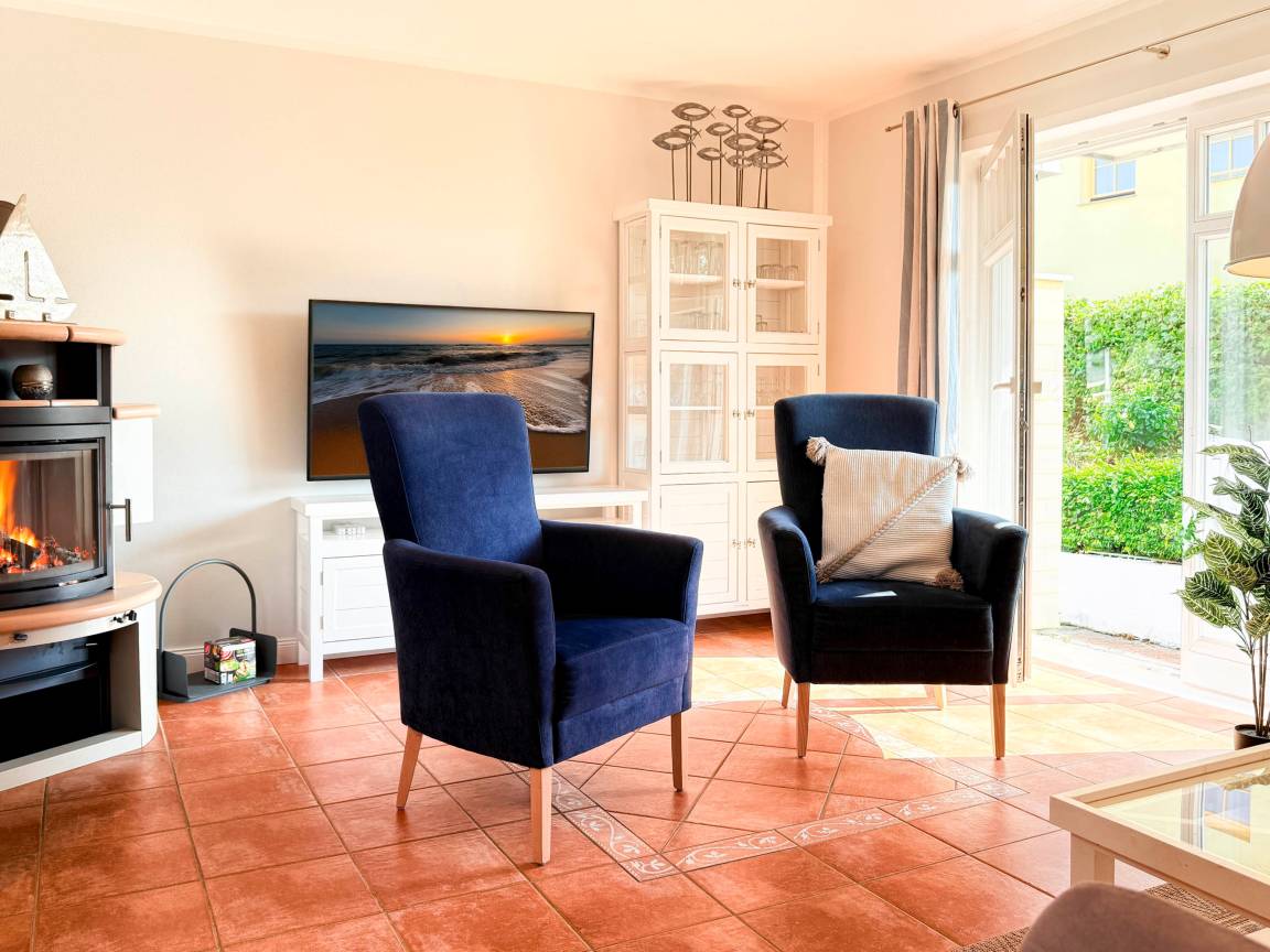 Gemütlicher Wohnbereich mit Kamin und Blick in den Garten