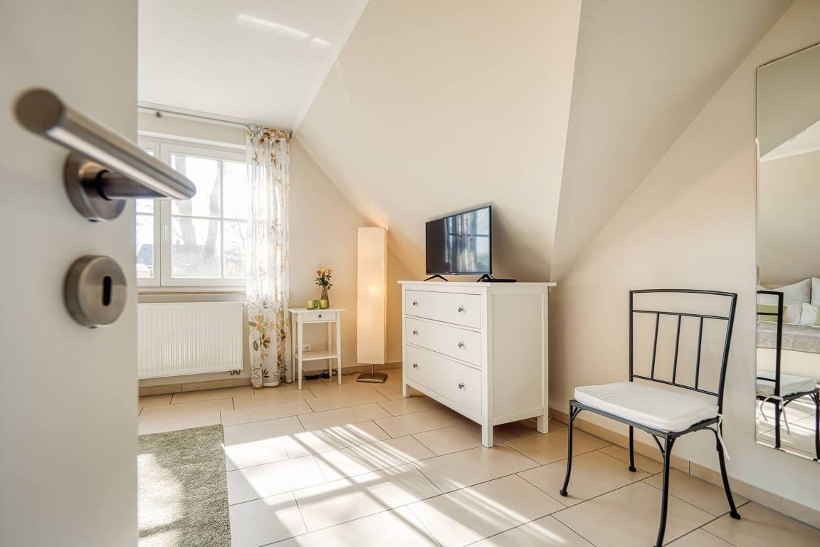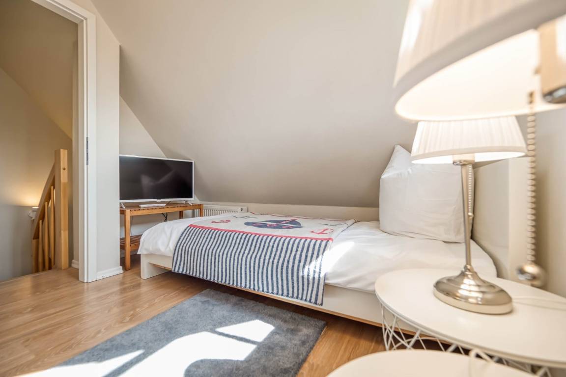Im Dachgeschoss befindet sich der dritte Schlafraum mit zwei Einzelbetten. Kinderreisebett und Hochstuhl sind ebenfalls vorhanden.