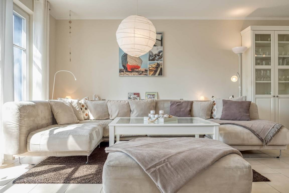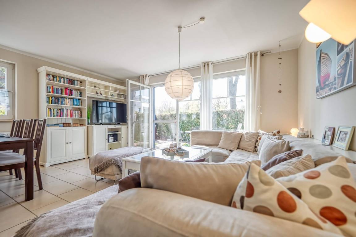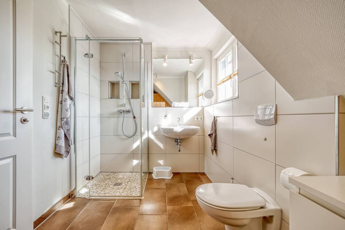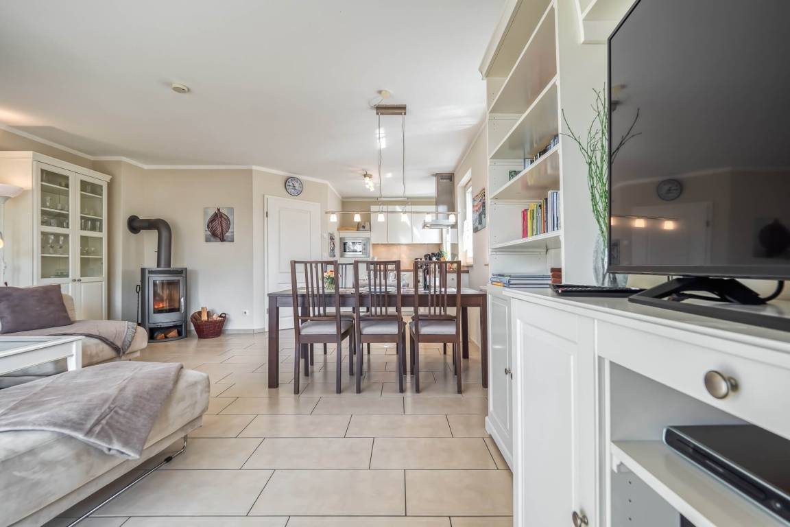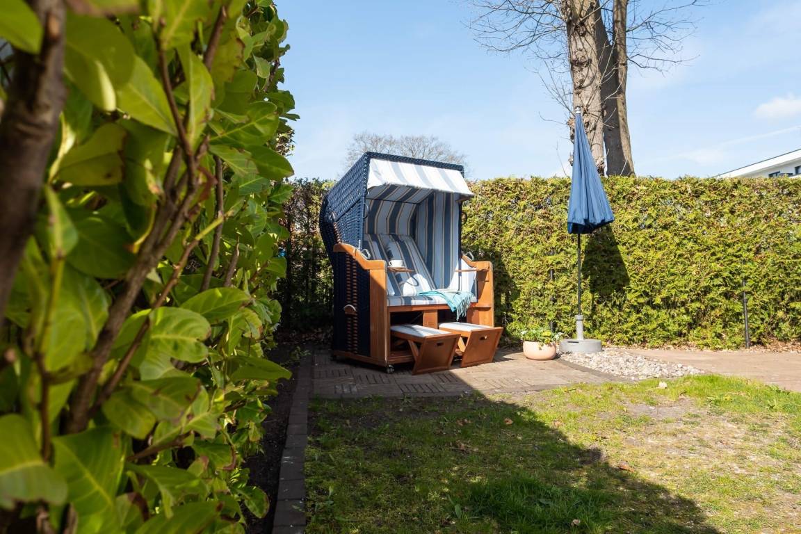 Im HWR steht eine Waschmaschine mit Trockner für Sie bereit. Alle Räume im EG haben Fußbodenheizung. Auf der nach Süd-Westen ausgerichteten Terrasse können Sie den Sonnenuntergang in bequemen Gartenmöbeln sowie einem Strandkorb genießen.