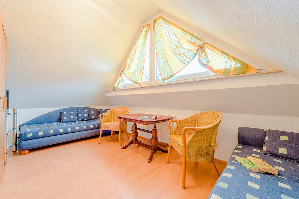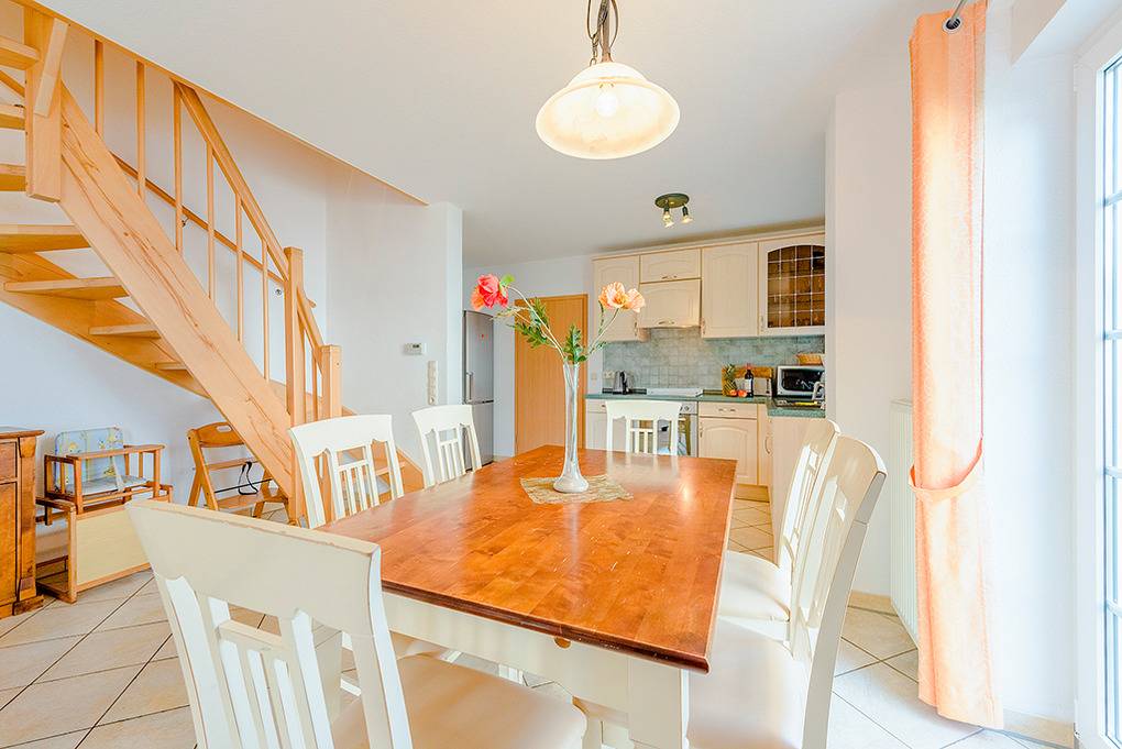 D 67.5403 Ferienhaus 1-6 Pers.: Schöne 4-Zimmerhaushälfte mit 85 qm über 3 Etagen. Parterre: Heller, freundlicher Wohnraum mit gemütlicher Couchgarnitur (Ausziehcouch 2 Pers.), Sat-TV, Esstisch, moderner Küchenzeile (Backofen, Mikrowelle, Spülmaschine). Bad/WC. 1. Etage: Zwei Doppelzimmer. Bad/WC. Treppe in den Spitzboden: 2-Bettzimmer mit Einzelliegen. Die max. Belegung von 6 Personen darf nicht überschritten werden!