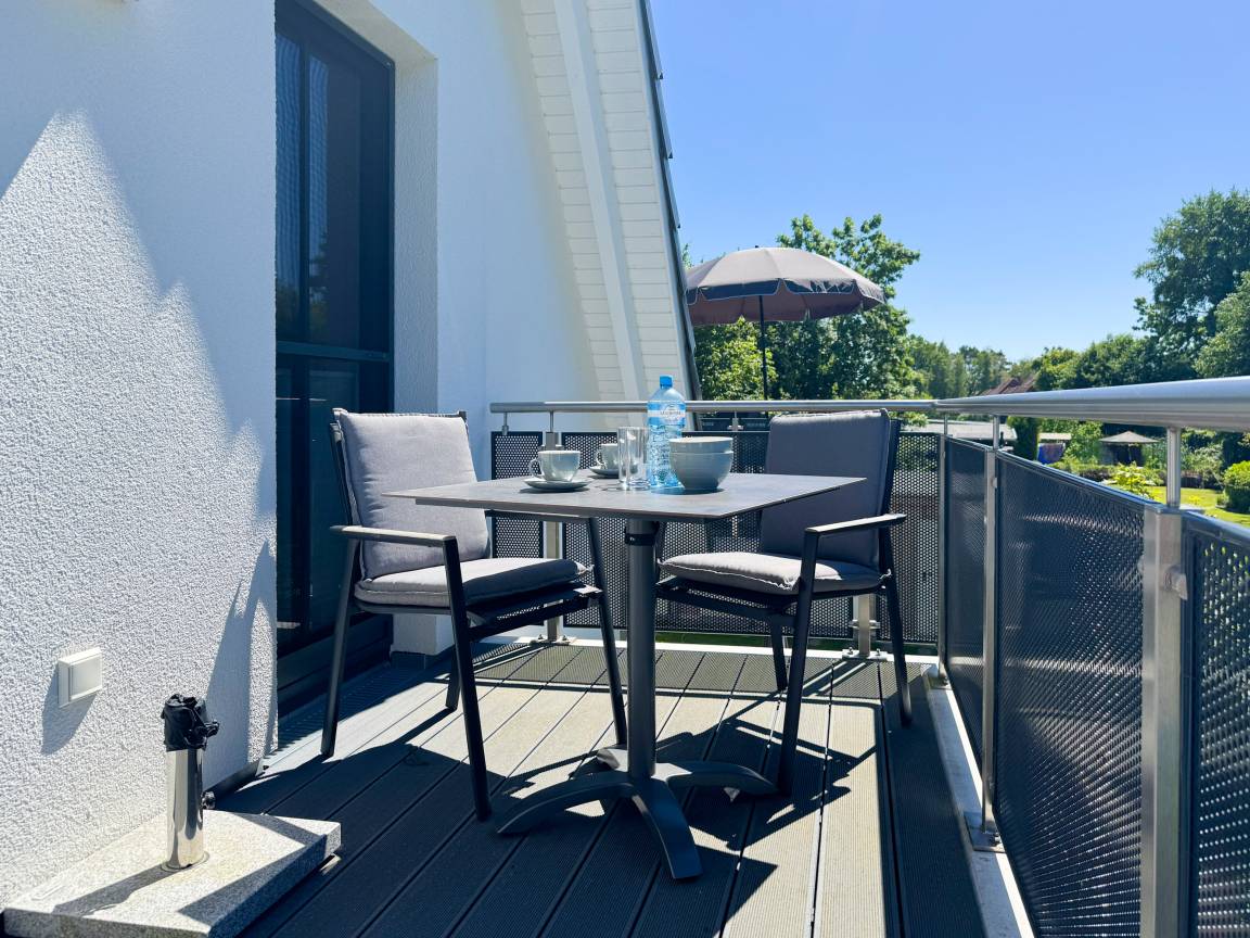 Beginnen Sie den Tag mit einem Frühstück auf dem sonnigen Balkon und lassen Sie den Blick über die Dächer von Zingst in Richtung Himmel und Meer schweifen.