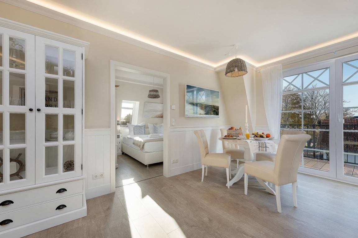 Die Villa Strandblick im Ostseeheilbad Zingst bietet eine exklusive Ferienwohnung für bis zu 4 Personen. Die Einheit verfügt über zwei geschmackvoll eingerichtete Schlafzimmer, beide mit Flat-TV, sowie ein modernes Badezimmer mit ebenerdiger Dusche, Fußbodenheizung und Wellnessdusche. Die voll ausgestattete Küche beinhaltet einen Geschirrspüler, Herd und eine Dunstabzugshaube, um kulinarische Köstlichkeiten zu zaubern. Der großzügige Wohnbereich zeichnet sich durch indirekte Beleuchtung in den Stuckleisten aus und bietet Zugang zu einem großen Balkon, von dem aus seitlicher Meerblick genossen werden kann. Zusätzlich sorgt ein Kamin für wohlige Wärme an kühlen Abenden. Gäste können den kleinen, aber feinen Wellnessbereich mit Sauna im Dachgeschoss nutzen. Die Ferienwohnung ist barrierefrei zugänglich, da ein Fahrstuhl zur Verfügung steht.