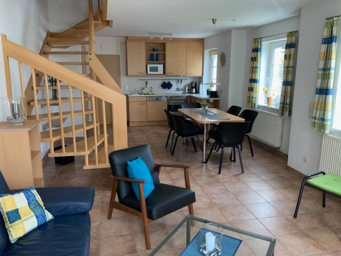 Im Erdgeschoss befindet sich der Wohnbereich mit Essküche sowie einem WC. Die Küche ist komplett mit Kühlschrank, Geschirrspüler, Herd mit Backofen, Mikrowelle, Toaster, Kaffeemaschine, Wasserkocher... ausgestattet.