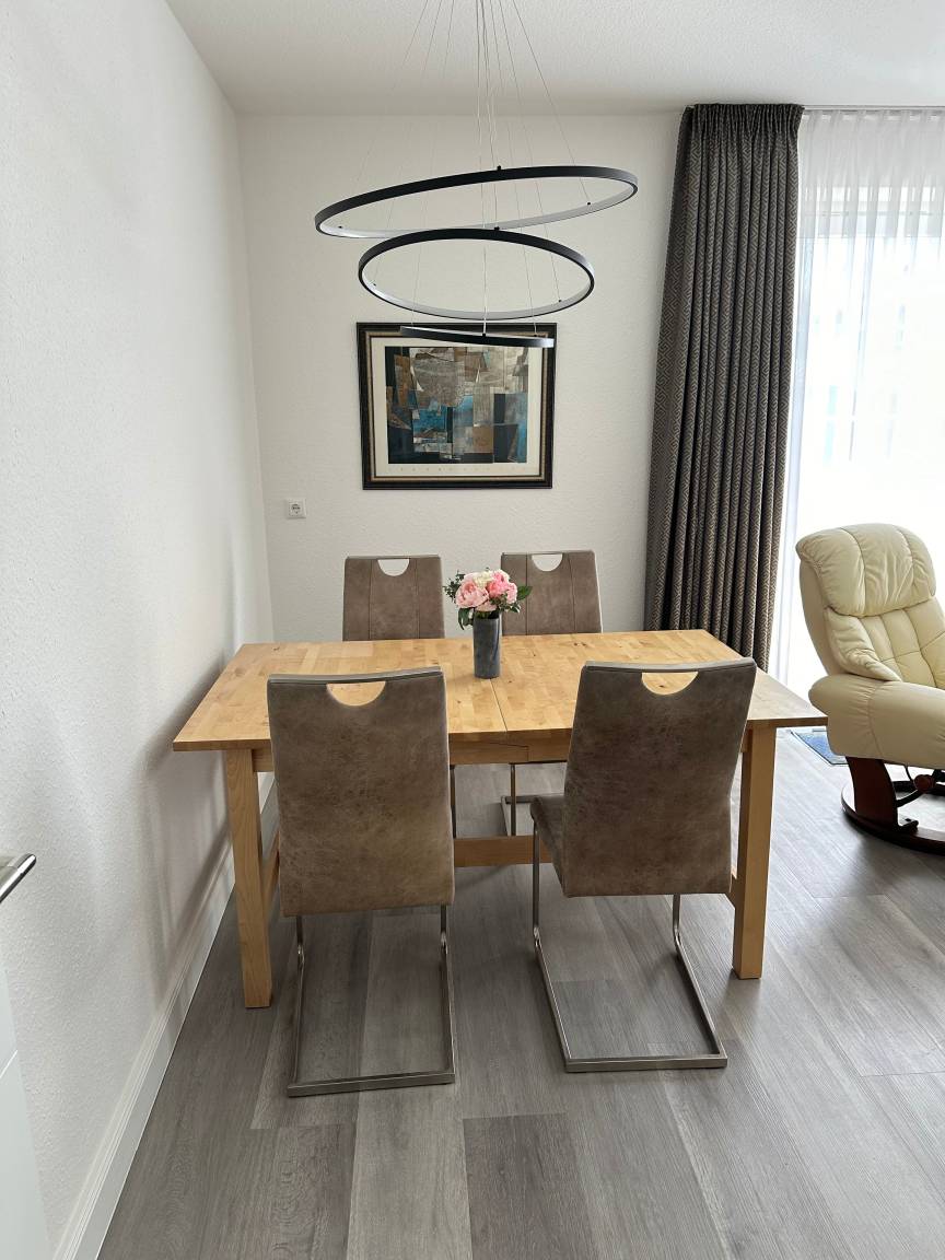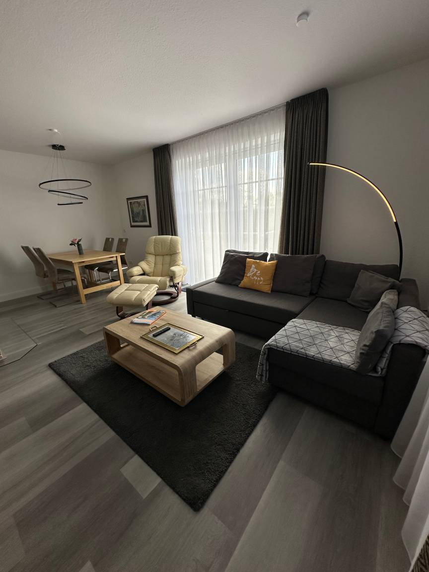 Im Wohnzimmer können Sie sich auf einem bequemen Sofa (das zusätzlichen Schlafplatz für zwei Personen mit einer Liegefläche von 140x200 inklusive Topper bietet) entspannen und Ihre Lieblingssendungen auf dem 65 Zoll Fernseher genießen. Persönlicher Zugang zu Netflix, Disney, Amazon TV Now ist selbstverständlich möglich. Der gemütliche Stressless Sessel lädt zum Verweilen ein, während der Esstisch perfekt für gemeinsame Mahlzeiten ist. Der Zugang zur großen Terrasse mit einem Strandkorb bietet Ihnen die Möglichkeit, die frische Luft und die Sonne zu genießen.
