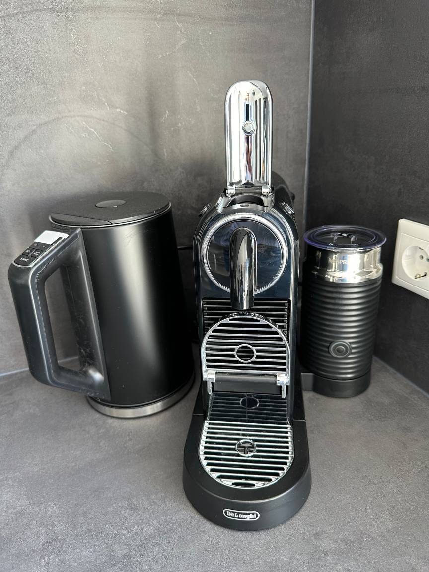 Die komplett mit ausreichend Geschirr, Besteck und Geschirrhandtüchern ausgestattete Küche verfügt über einen Essplatz sowie eine Zubereitungsküche mit einer Waschmaschine und einem Waschtrockner für Ihre Bequemlichkeit. Eine DeLonghi-Kaffeekapselmaschine mit Milchaufschäumer, ein Toaster, ein Wasserkocher und ein Smoothie-Maker von WMF sowie ein Thermomix TM5 mit WLAN Modul stehen ebenfalls zur Verfügung.