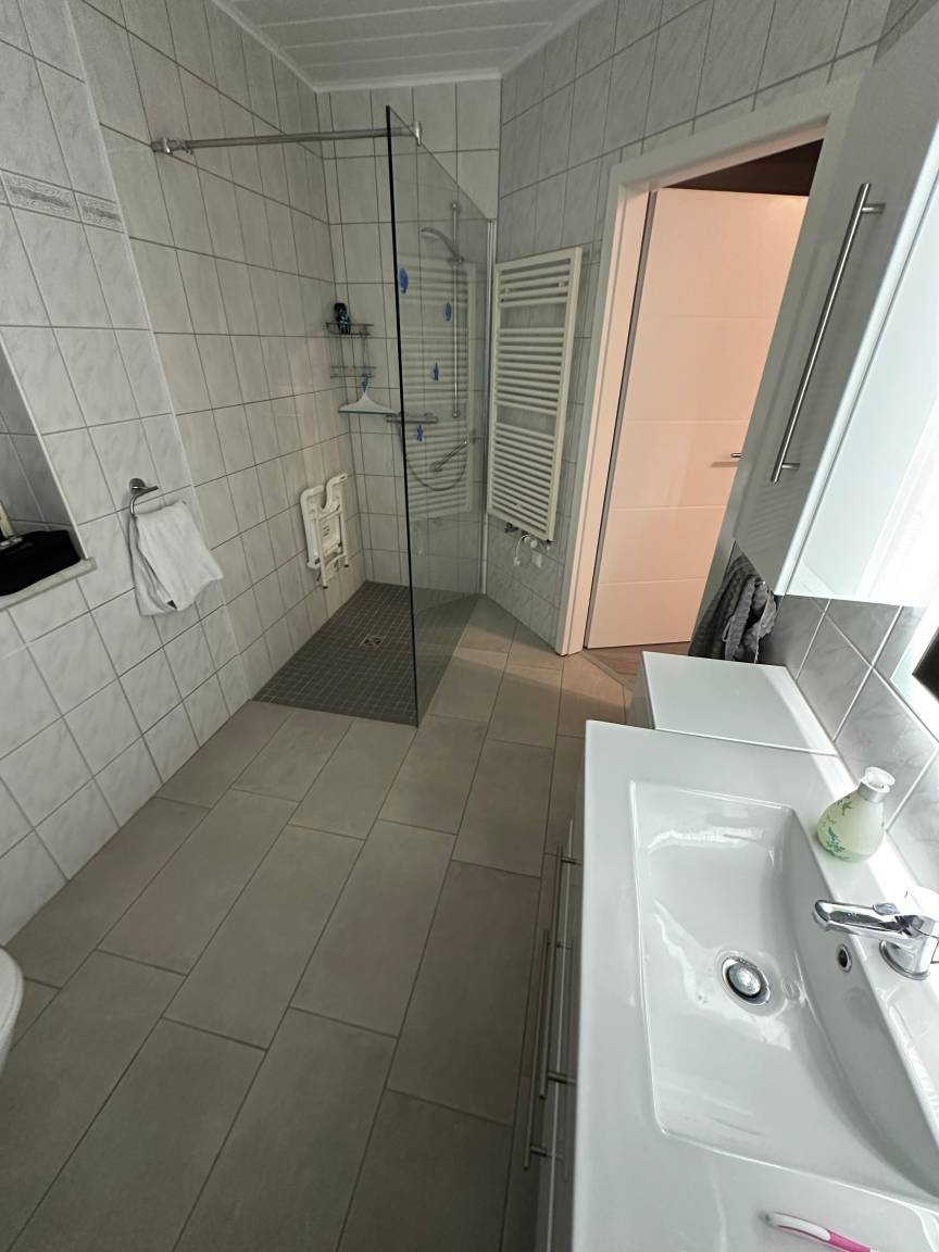 Das sehr großzüge ebenfalls barrierefreie Bad mit Fenster hat ein WC mit Halte- und Stützgriff und eine ebenerdige Dusche mit Glastrennwand, Haltegriff und Sitzmöglichkeit. Selbstverständlich ist ein Föhn und ein Kosmetikspiegel mit 10facher Vergrößerung zu Ihrer Verfügung.