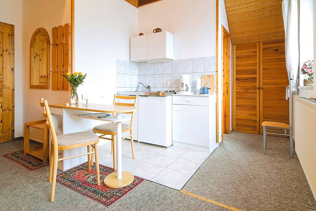 D 67.27 Wohnung 1-2 Pers: Schönes Studio mit 30 qm Wohnfläche, 1. Etage. Wohn-/Schlafraum mit Flachbild-Sat-TV, DVD, Esstisch, Pantryküche (2 Pl. E-Herd, Mikrowelle, Backofen), Doppelbett. Bad/WC.