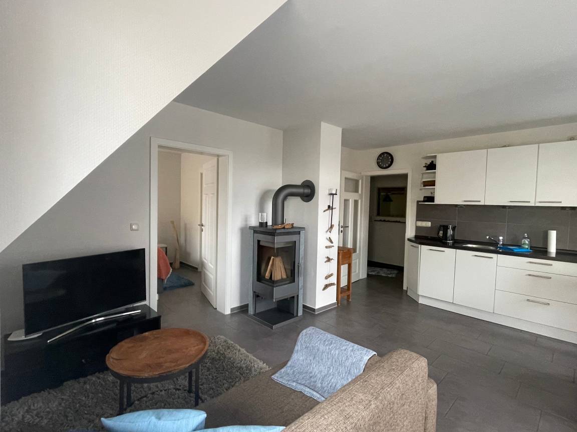 Die Ferienwohnung ist ausgestattet mit einem Wohnraum, zwei Schlafräumen (1x Doppelbett , 1x Futonbett (160 cm breit)), einer komplett eingerichteten
