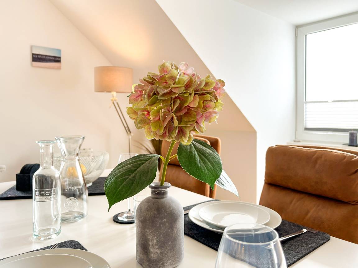 Die Ferienwohnung "Koje dreizehn" empfängt Sie mit einer harmonischen Kombination aus modernem Komfort und maritimem Ambiente. Der lichtdurchflutete Wohnbereich lädt zu entspannten Stunden ein, während die offene Küche mit allem ausgestattet ist, um Ihre Lieblingsgerichte zuzubereiten. Genießen Sie Ihre Mahlzeiten auf dem sonnigen Balkon und lassen Sie den Tag in gemütlicher Atmosphäre ausklingen. Das moderne Badezimmer und das komfortable Schlafzimmer bieten zusätzlichen Komfort für erholsame Nächte.
