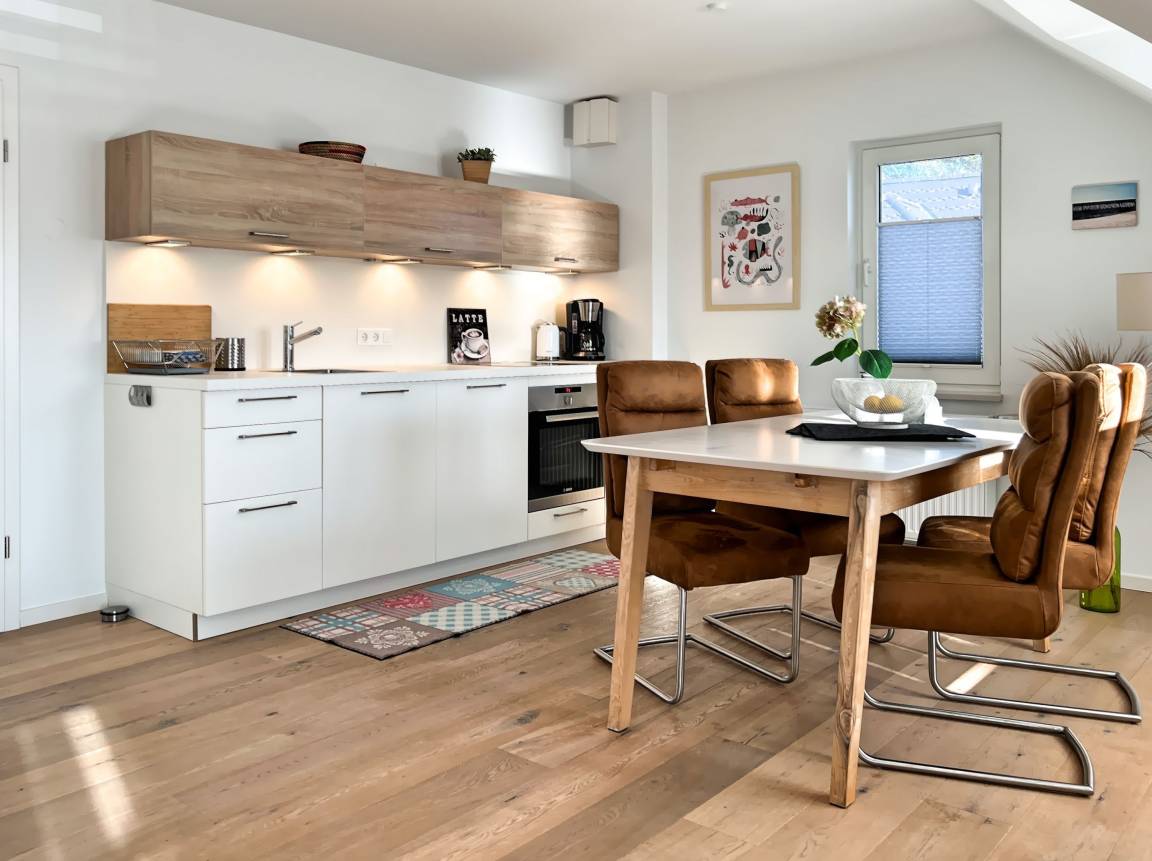 Küche und Essbereich: Offene, voll ausgestattete Küche mit Ceranfeld, Backofen, Kühlschrank, Filterkaffeemaschine, Toaster und Wasserkocher. Die angrenzende Essgruppe lädt zu geselligen Mahlzeiten ein.