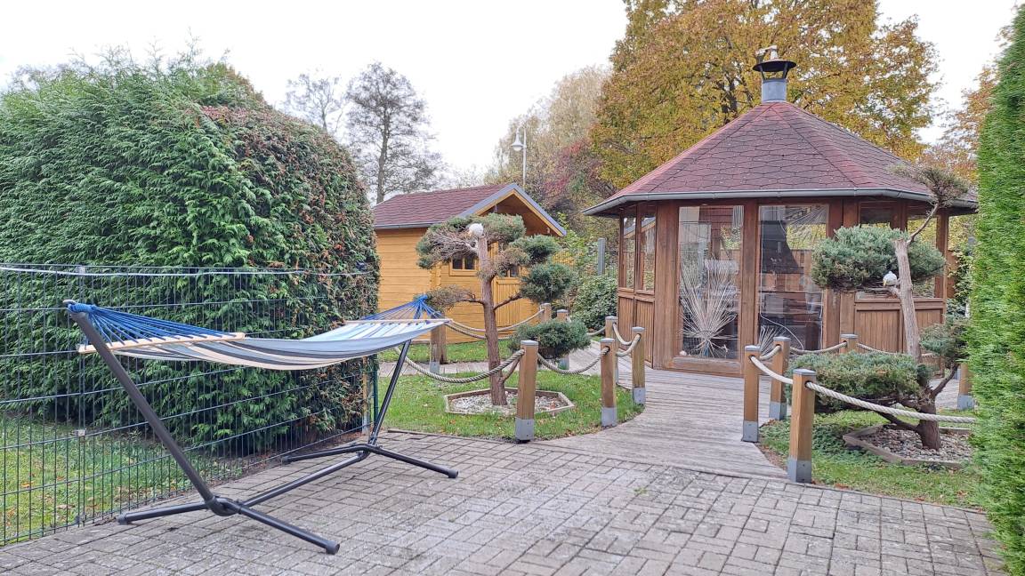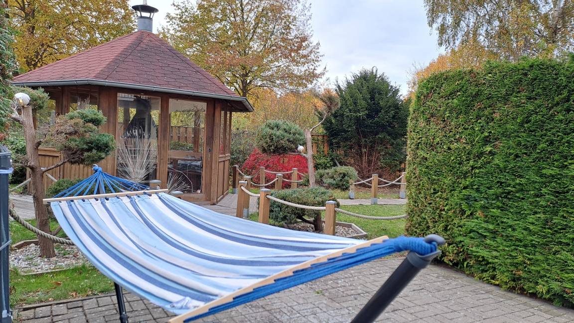 Über ein großes Fenster gelangt viel Licht in den Wohnraum. Von hier aus gelangen Sie auch auf die möblierte TERRASSE, zu der auch ein privater Strandkorb und eine Hängematte gehören. Garten zur Alleinnutzung. Highlight ist eine Grillkota mit Platz für bis zu 6 Personen. Lassen Sie den Abend bei einem wärmenden Feuer ausklingen.