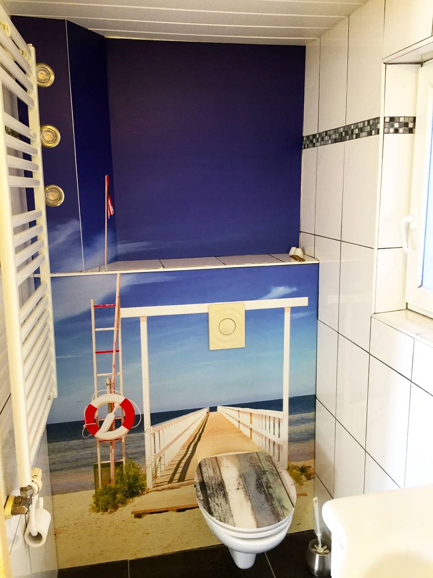 Die ebenerdige Terrassenwohnung vermittelt schon beim Betreten Ostsee-Urlaubs-Feeling. Der großzügige Eingangsbereich und die offene Wohnküche sind in maritimen Look gestaltet. Unikate Teakholzmöbel aus recycelten Fischerbooten, bilden einen Kontrast zur modernen Küchenzeile mit hochgesetztem Backofen, einem 4-er Ceranfeld und selbstverständlich Kühlschrank und Geschirrspülmaschine.
