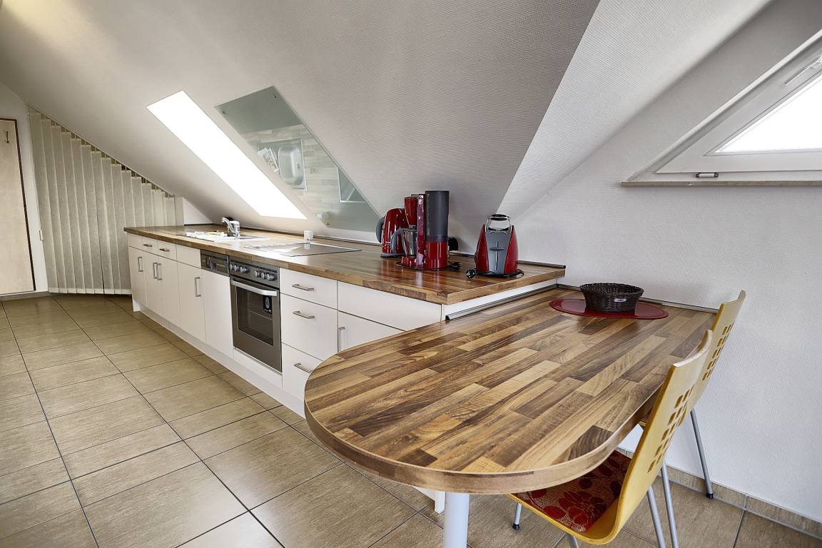 Die gut ausgestattete Küche besitzt unter anderem einen Kühlschrank, einen Herd zum Kochen und sogar eine Spülmaschine.