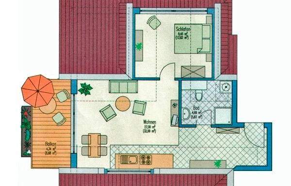 46 m² Ferienwohnung ∙ 1 Schlafzimmer ∙ 2 Gäste