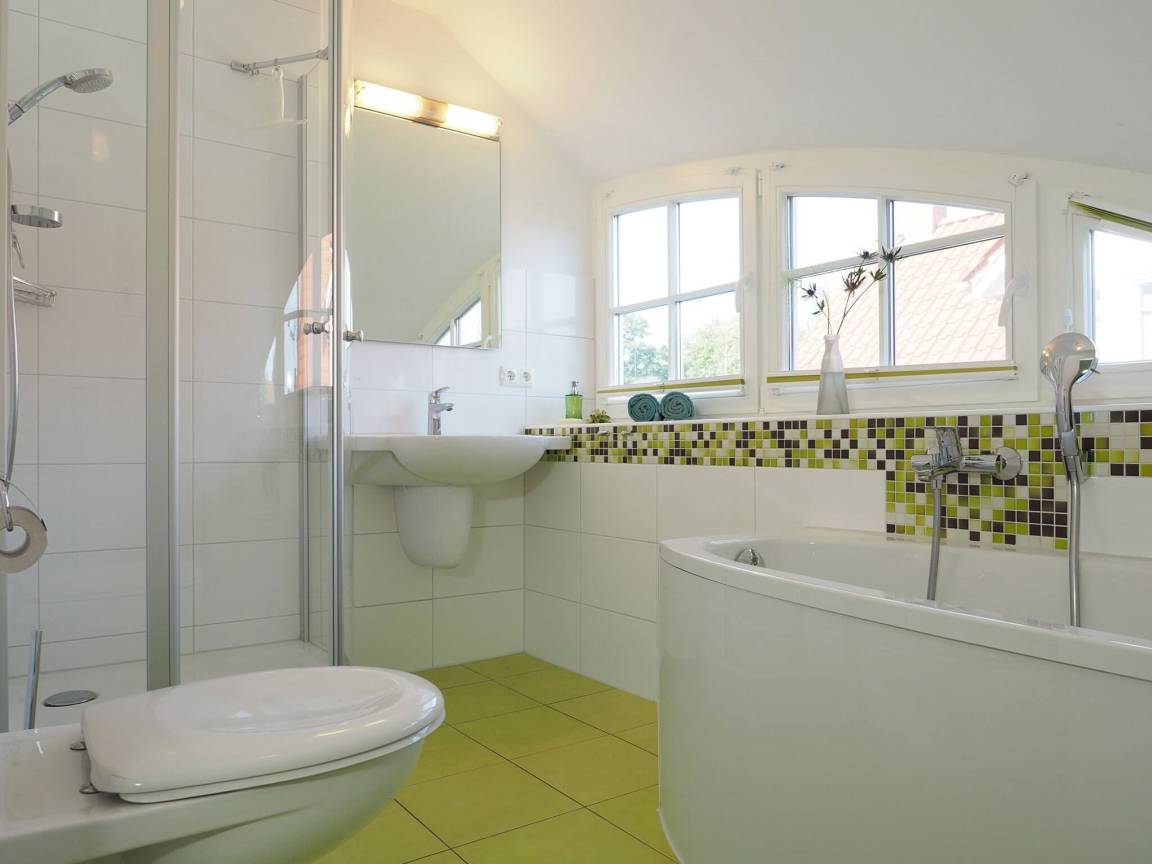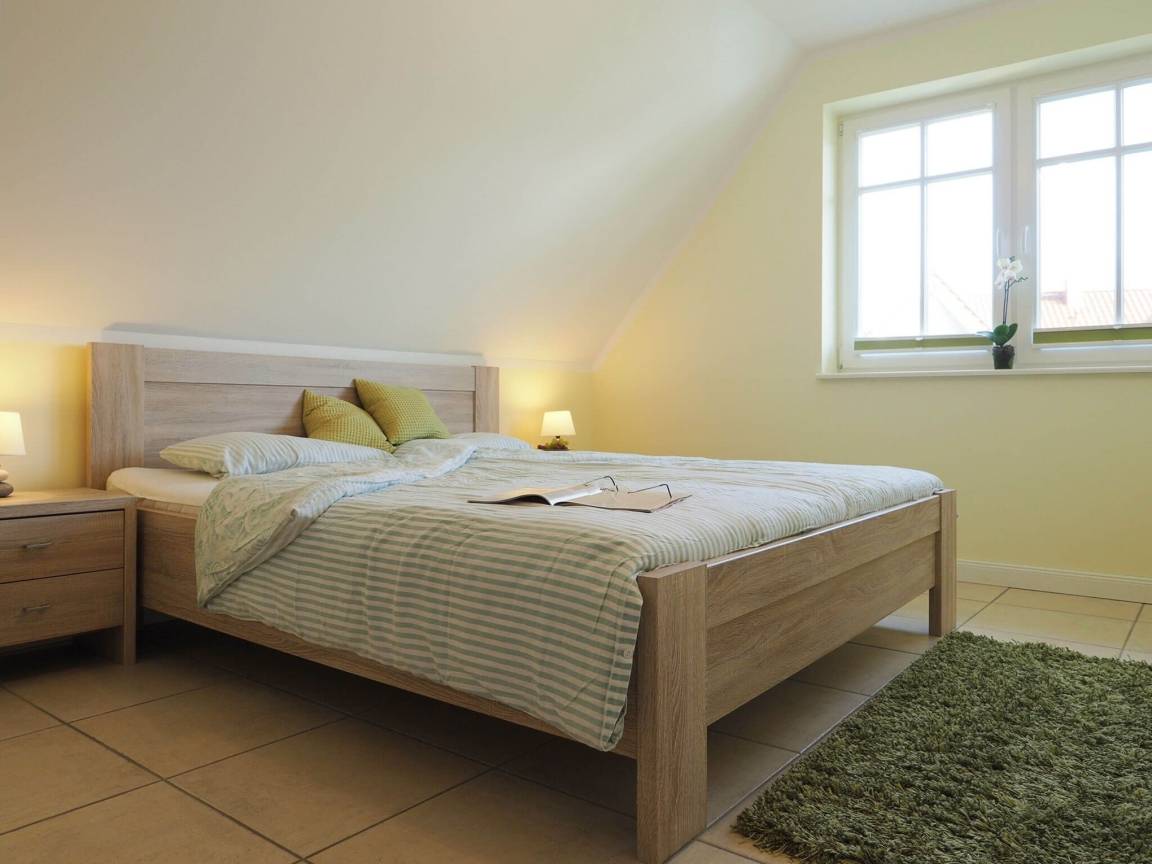 Es ist ausgestattet mit drei Schlafräumen (2x1 Doppelbett, 1x2 Einzelbetten), einem Wohnbereich mit einer Küchenzeile, sowie zwei Bädern (1 x DU/ WC und 1 x Eckbadewanne/DU/ WC). Zur weiteren Einrichtung gehören ein Farb- TV,