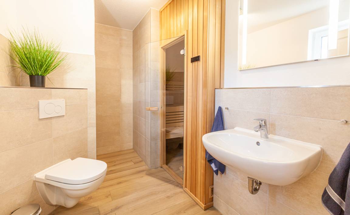 ... und ist ausgestattet mit drei Schlafräumen (1x1 Doppelbett, 1x1 Doppelbett, 1x2 Einzelbetten) jeweils mit zusätzlichen Verdunklungsmöglichkeiten, einem Wohnbereich mit Kamin und einer Küchenzeile (Mikrowelle, Cerankochfeld, Backofen, Kühlschrank mit Gefrierfach, Spülmaschine, Kaffeemaschine), zwei Bädern (1 x bodengleiche Dusche / WC und Sauna,
