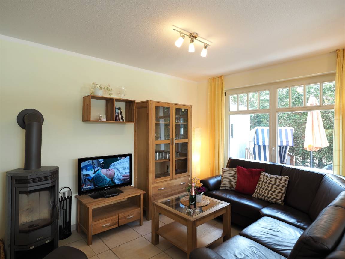 - Wohnraum mit Ecksofa, Sessel, Kaminofen , Esstisch, TV
