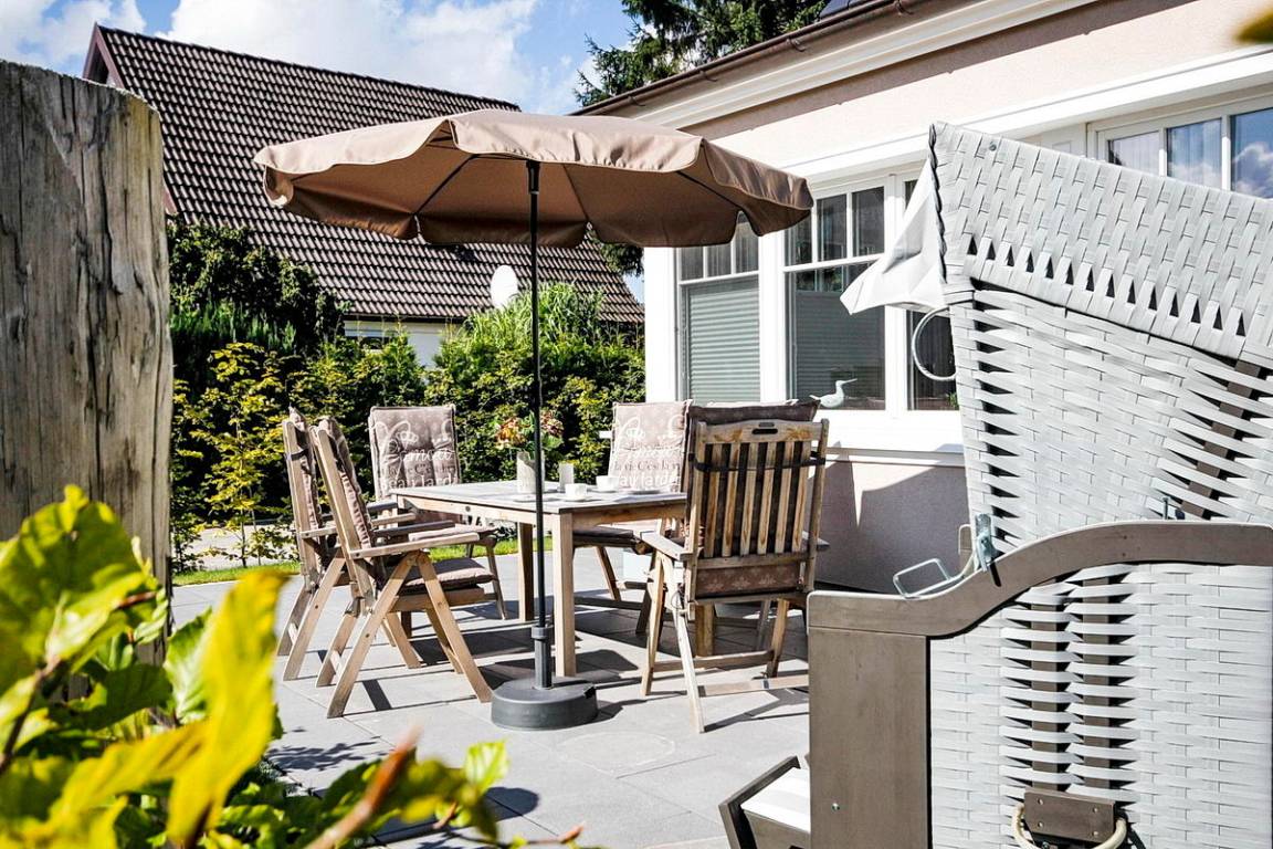 Die Terrasse mit eigenem Strandkorb bietet sonnige Ruheplätze, während der Garten Raum für Entspannung und gemeinsame Momente schafft.