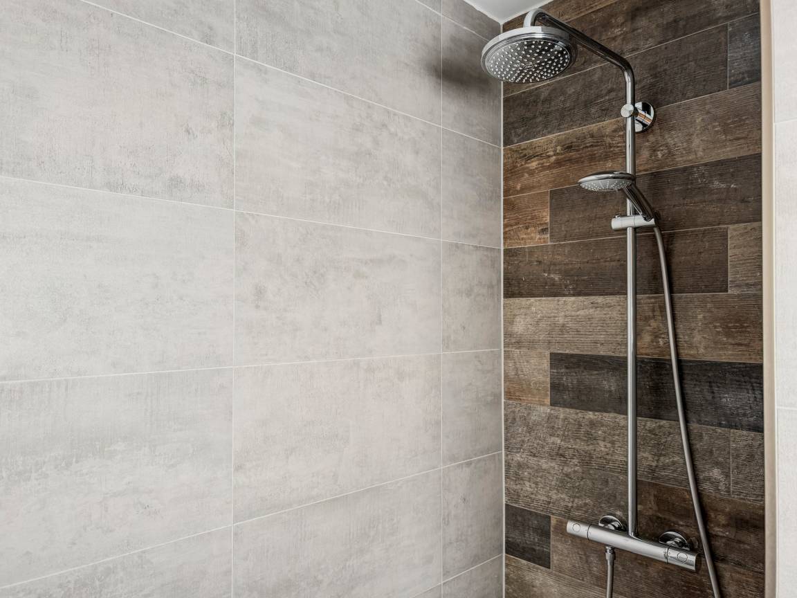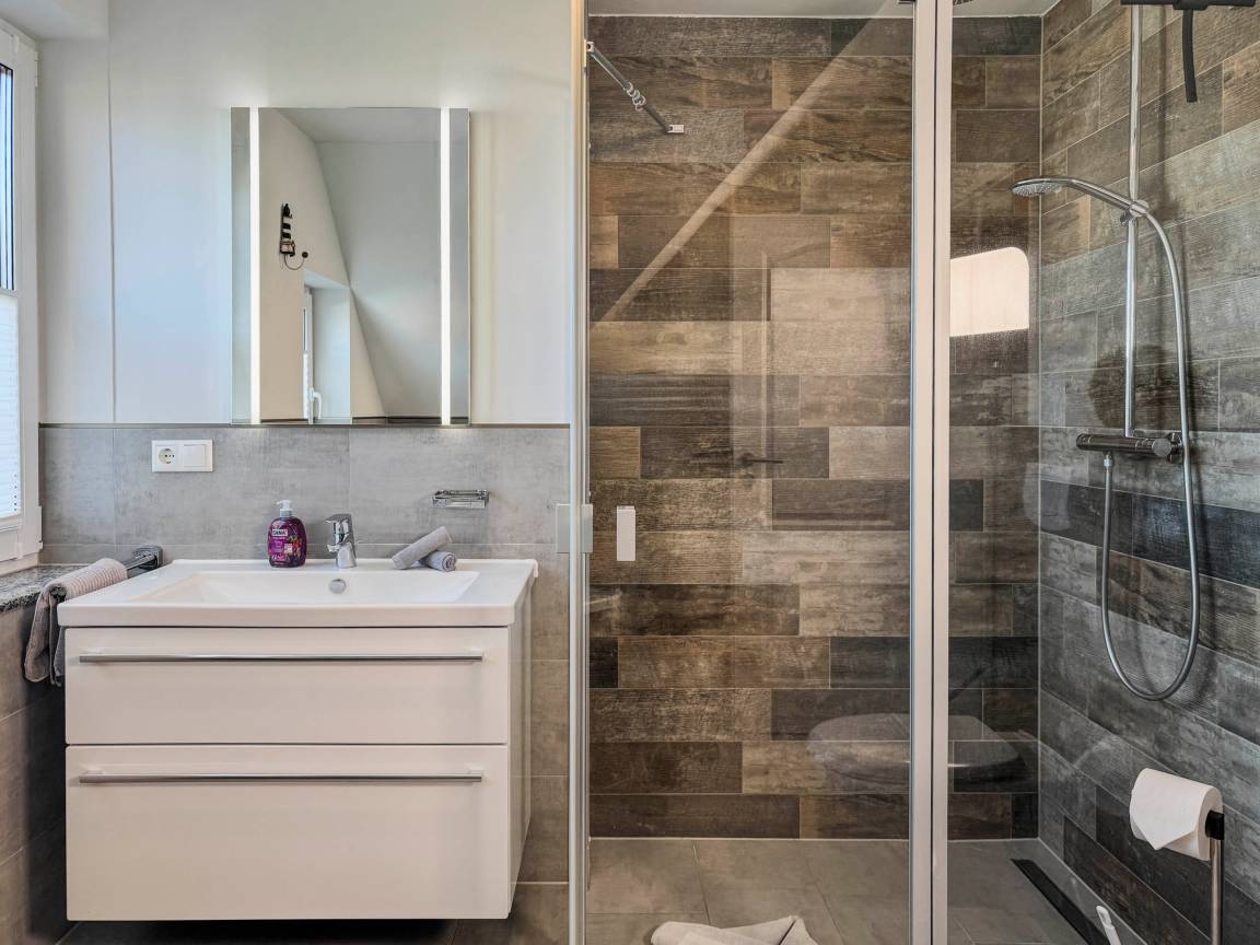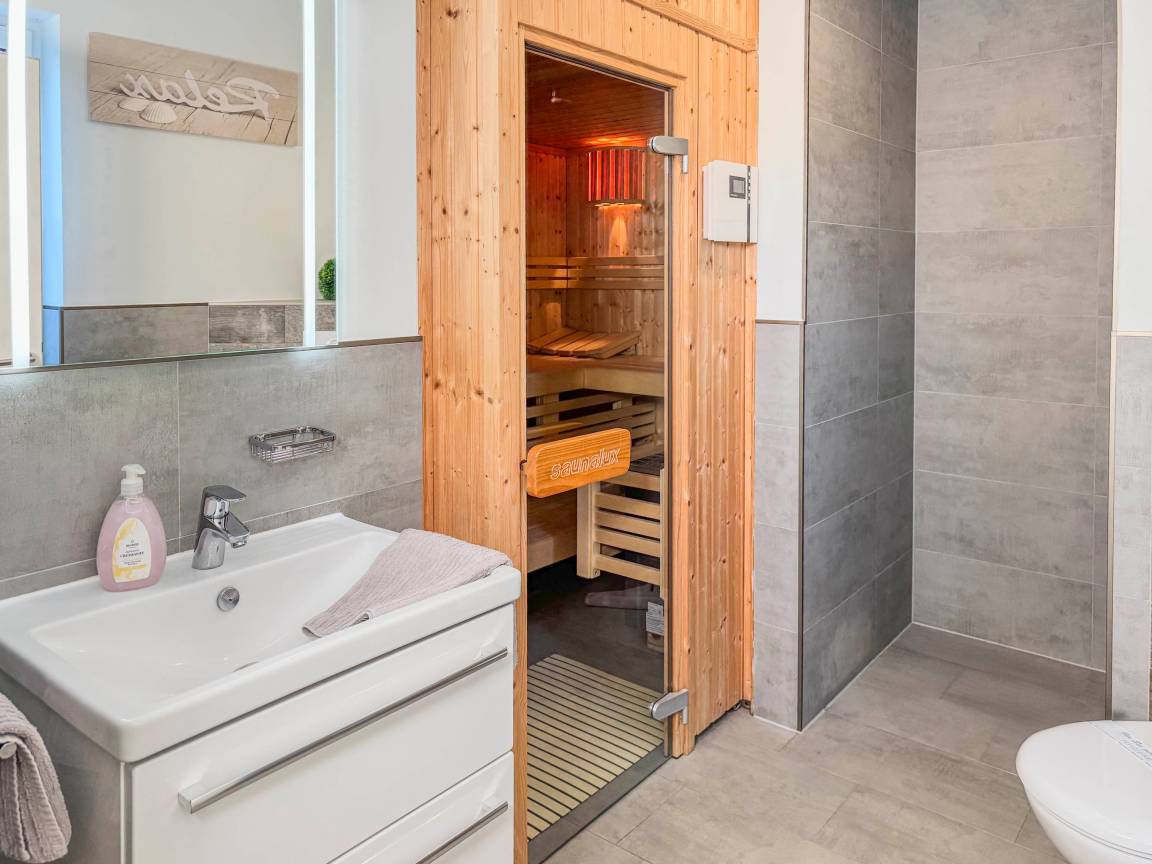 Zwei Badezimmer: eines mit Badewanne und Dusche, eines mit Dusche und Sauna