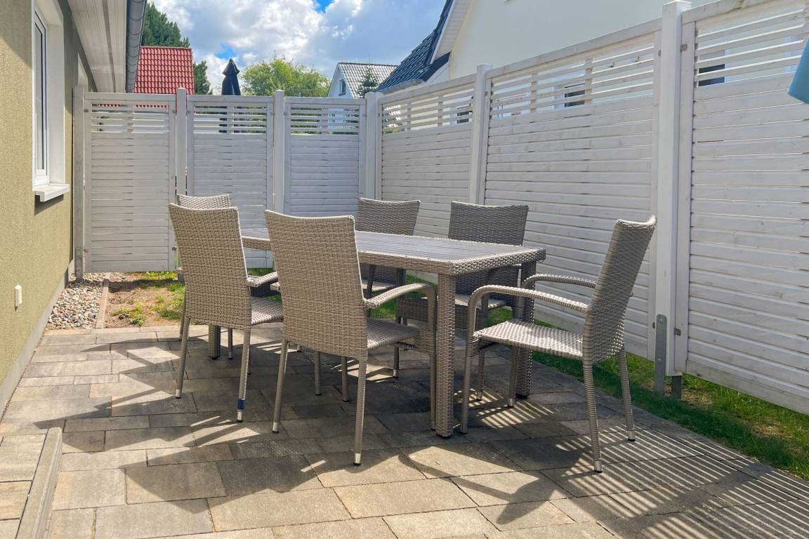 Nach einem erlebnisreichen Tag an der frischen Ostseeluft lädt die private Sauna zum Entspannen ein und bietet die perfekte Möglichkeit, müde Muskeln zu lockern und zur Ruhe zu kommen. Starten Sie den Tag auf der sonnigen Terrasse mit einem gemütlichen Frühstück oder genießen Sie abends die letzten Sonnenstrahlen im Garten. Die hochwertigen Gartenmöbel und der Sonnenschirm bieten zusätzlichen Komfort für entspannte Stunden im Freien.