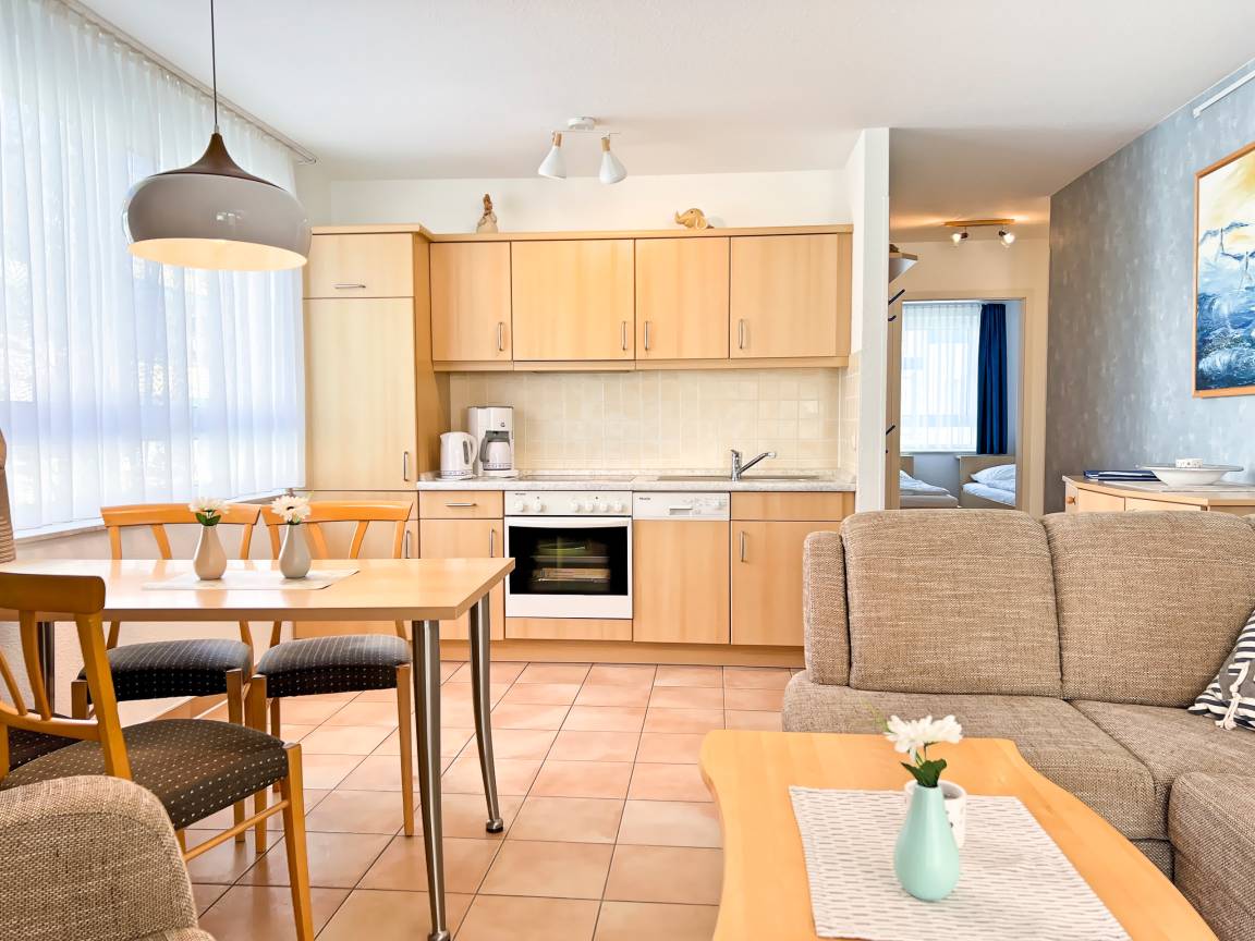 Wohnbereich: Gemütlicher Wohn- und Essbereich mit moderner Einbauküche, Essplatz und Sitzgruppe